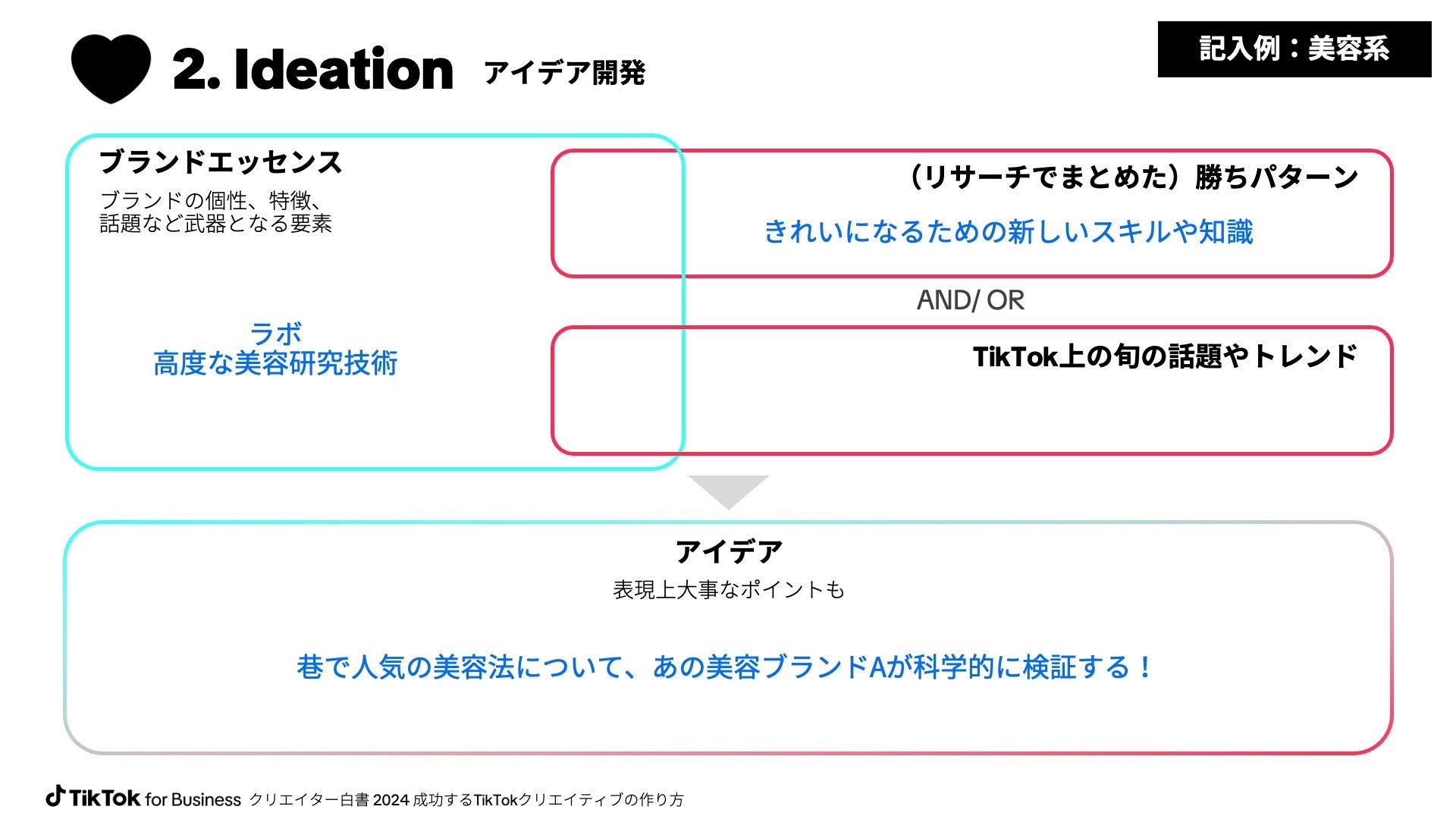 『2. Ideation / アイデア開発』では、『1. Research / リサーチ』のSTEP.2で見つけた“勝ちパターン”とブランドエッセンスを掛け合わせて、ブランド独自の新しいアイデアを生み出していきます。