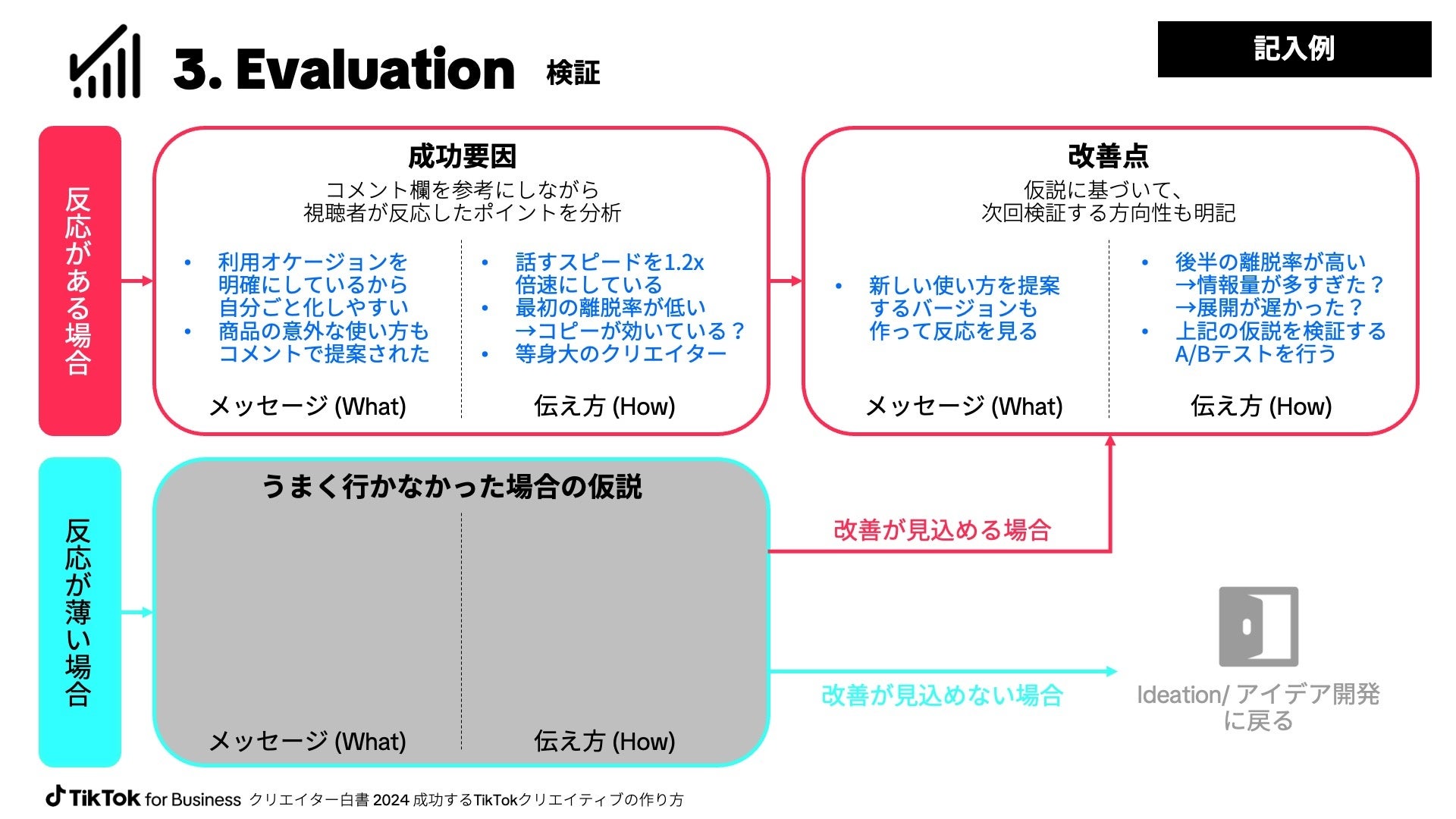 『3. Evaluation / 検証』では、『2. Ideation / アイデア開発』のアイデアを検証していきます。ユーザーからの反応がある場合は、コメント欄を参考にして成否要因を抽出し、改善点を洗い出します。