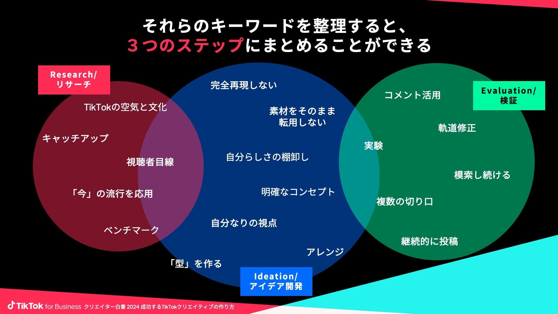 今回の取材を通じて、複数のクリエイターのコメントにいくつかの共通点を発見、それらはTikTokクリエイティブ作りにおける重要なキーワードであることが明らかになりました。そのキーワードを整理すると、以下3つのステップにまとめることができます。