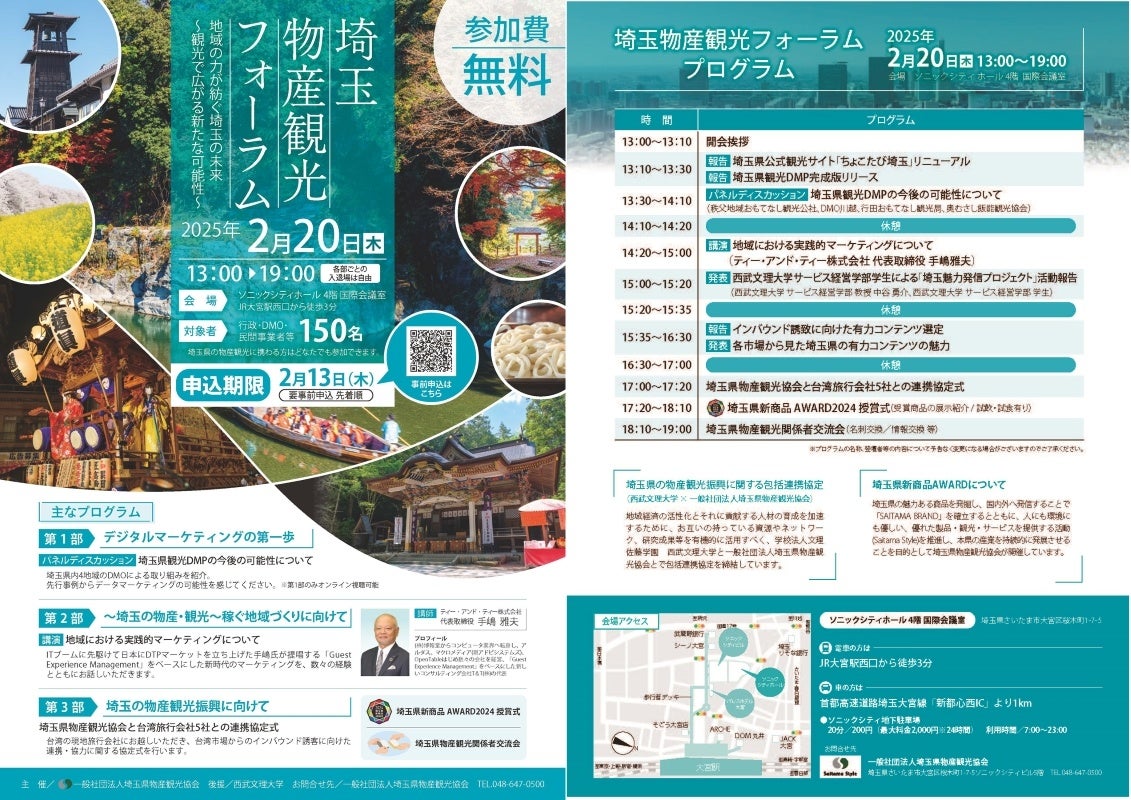 一般社団法人埼玉県物産観光協会(会長:朝霧重治)は、埼玉県全域の経営力向上や稼ぐ観光地域づくりを担う人材育成を推進するため、行政、DMO、民間事業者の皆様を対象とした「埼玉物産観光フォーラム」を開催することといたしましたのでお知らせします。
