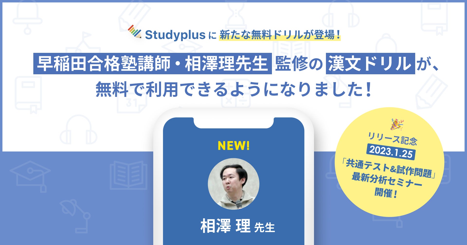 スタディプラス株式会社(本社:東京都千代田区、代表取締役:廣瀬高志、以下スタディプラス)は、2023年4月より教育機関向け学習管理プラットフォーム「Studyplus for School」の新機能「教材配信システム」の提供を開始いたします。これに先駆けて、2023年1月10日(火)より早稲田合格塾講師・相澤理先生監修の「漢文ドリル」を、無料提供することをお知らせいたします。