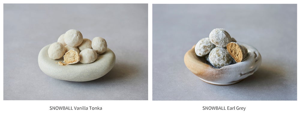 たっぷりのアーモンドパウダーとフランス産小麦の小麦粉をオーブンで焼いてから使用することで実現する、ほろほろと崩れる軽く儚い食感が特長のスノーボール。Mr. CHEESECAKEのシグネチャーフレーバーのクラシックをイメージした「Vanilla Tonka」や、ウバ茶にベルガモットの香りを合わせた上品な味わいを楽しめる「Earl Grey」の2種のフレーバーをご用意しました。