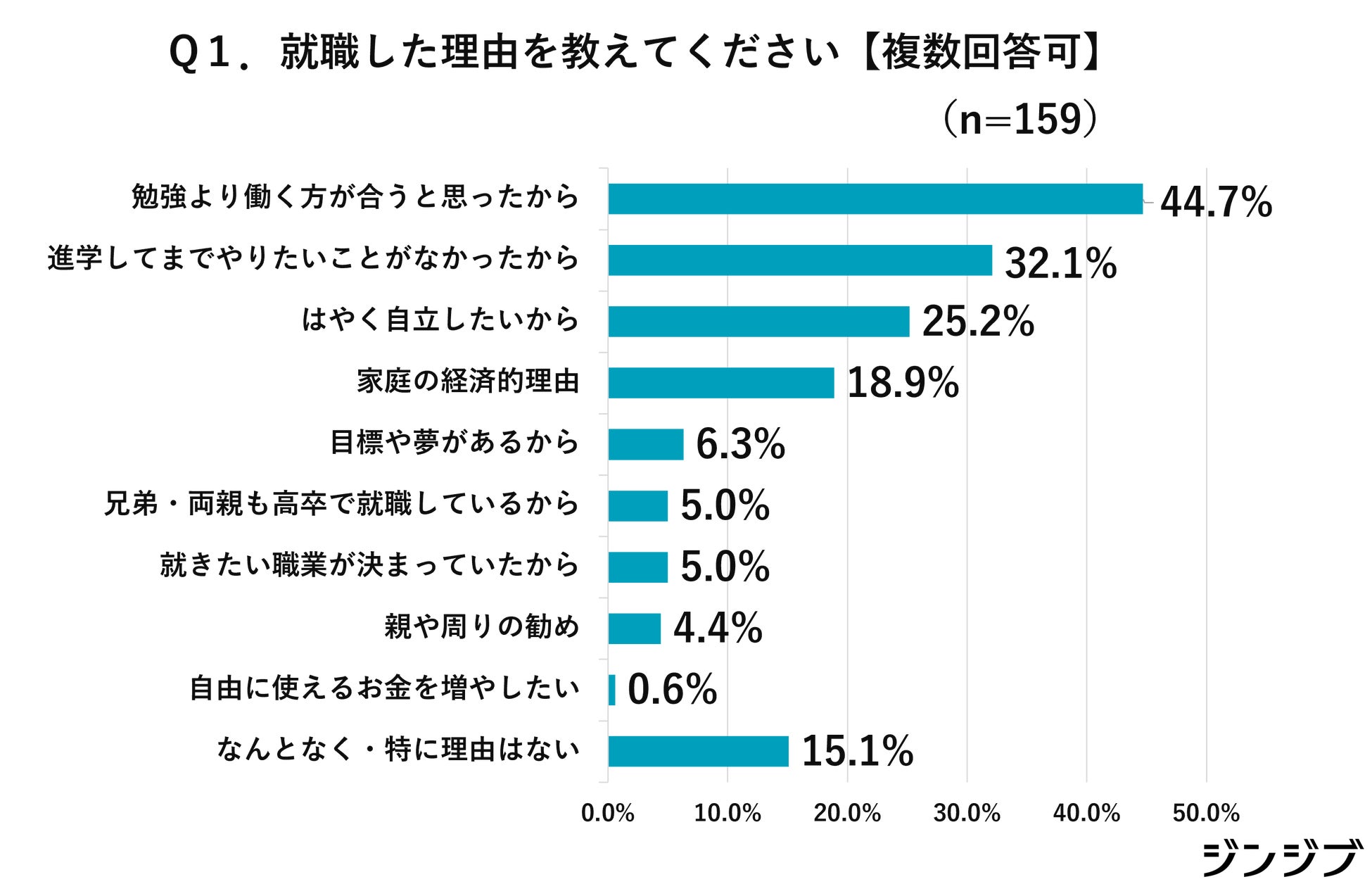 就職理由を聞いたところ「勉強より働く方が合うと思ったから(44.7%)」という回答が最も多く、次いで「進学してまでやりたいことがなかったから(32.1%)」と、「はやく自立したいから(25.2%)」という結果になりました。