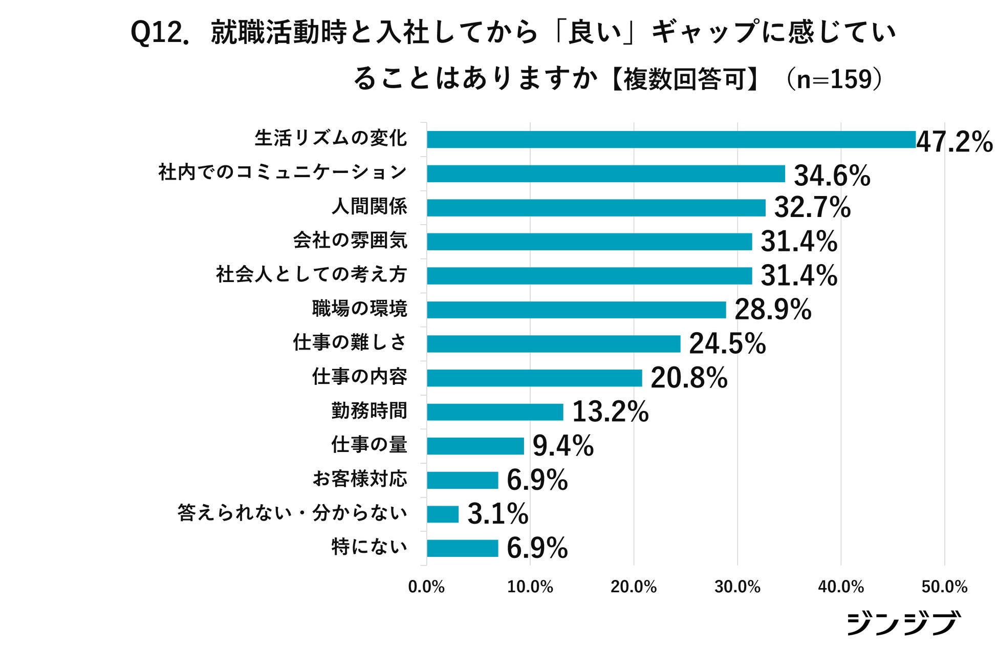就職活動時と入社してからの「良い」ギャップについて聞いたところ、「生活リズムの変化(47.2%)」次いで「社内でのコミュニケーション(34.6%)」、「人間関係(32.7%)」という結果になりました。