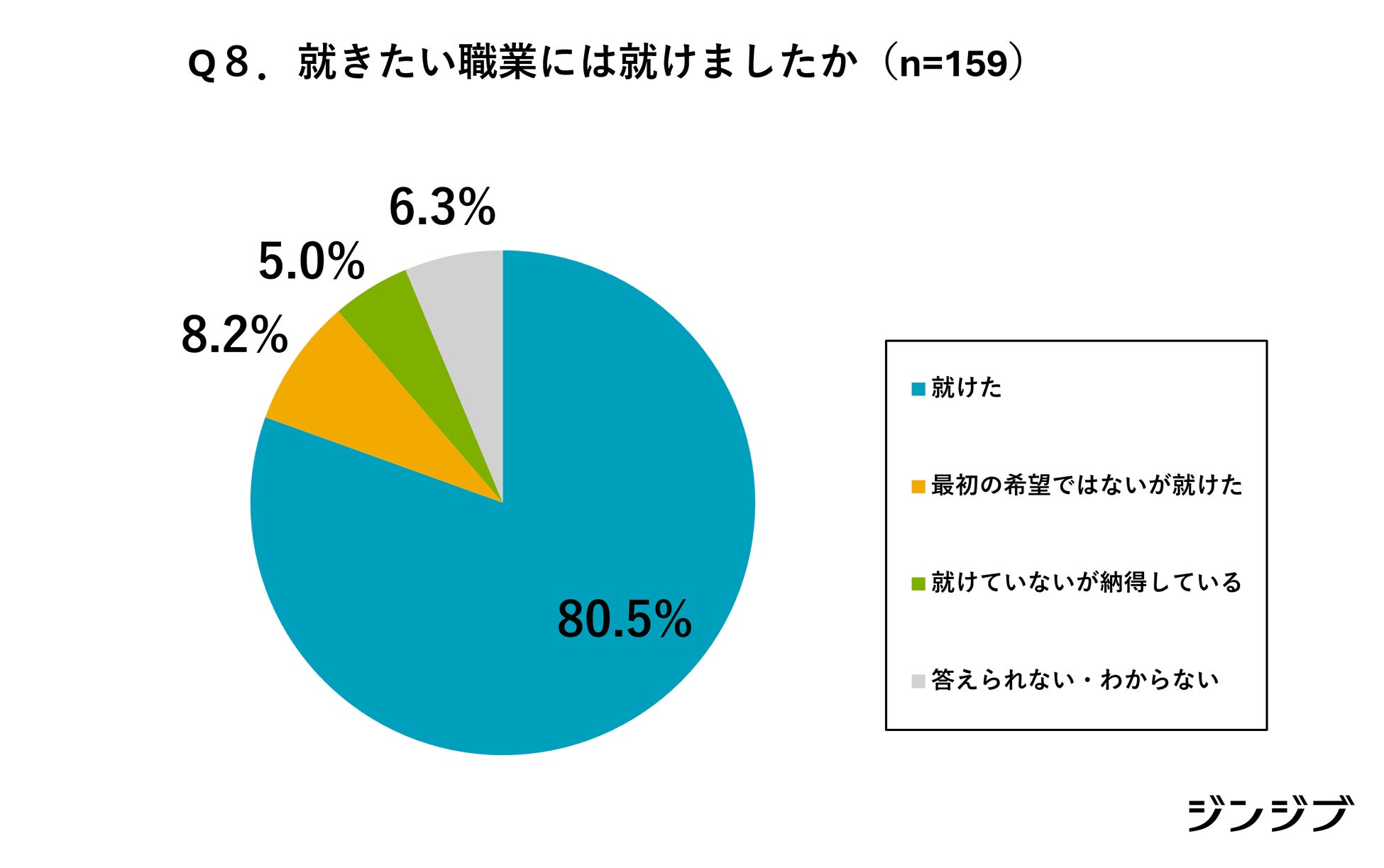 就きたい職業に就けたかどうかを聞いたところ、「就けた(80.5%)」と回答した人が最も多いことがわかりました。