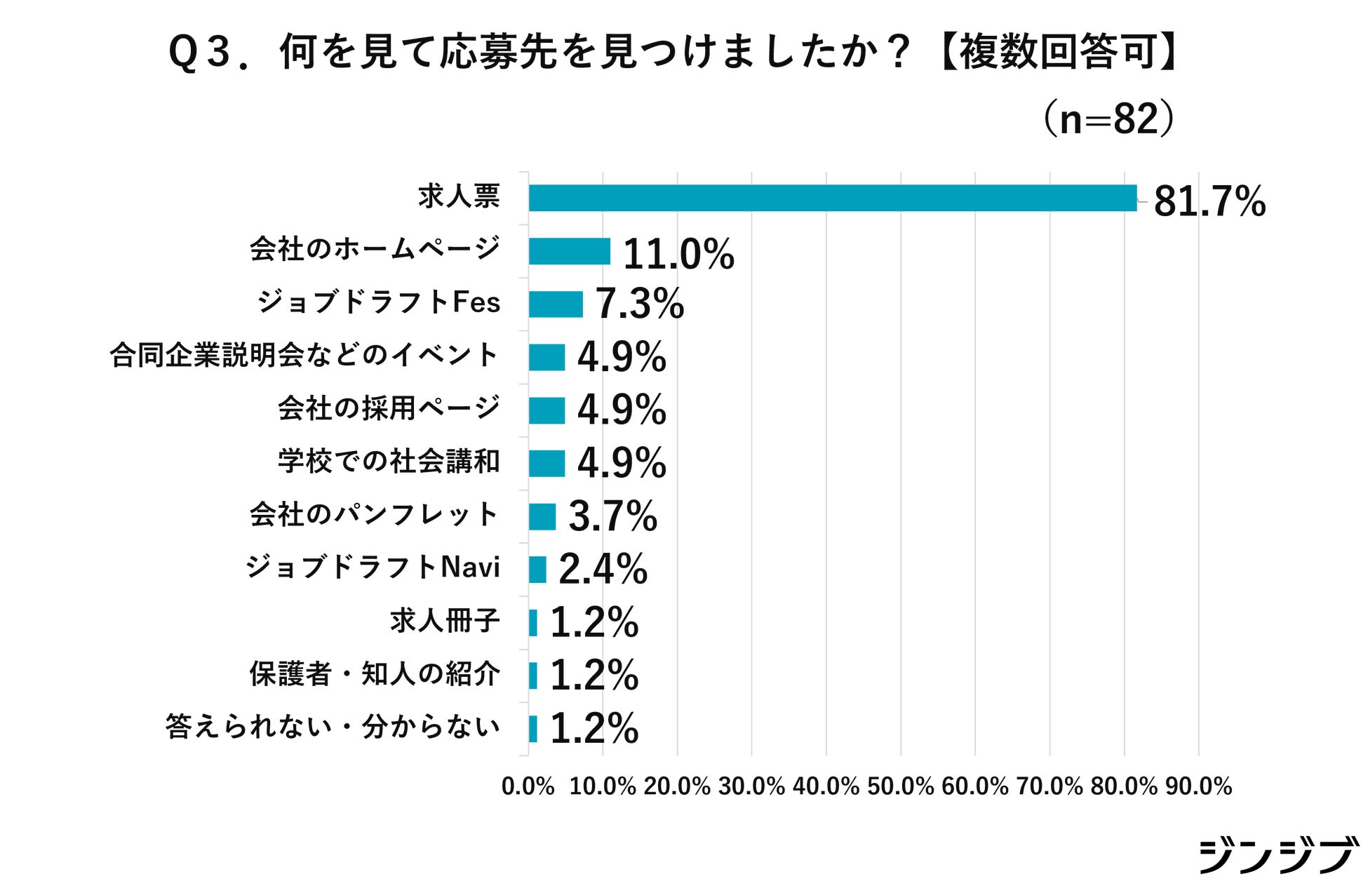 問2で、「先生から紹介してもらった」以外の回答をした方に、何を見て応募先を見つけたのかを聞いたところ、「求人票(81.7%)」が最も多い回答となりました。就職活動を行う高校生にとっては、学校に届く求人票を見て応募先を見つけていると言えます。次いで「会社のホームページ(11.0%)」で、昨年実施した『【高卒社会人アンケート】高校生の就活体験(23卒)』と比較すると1.4ポイント増加しました。求人票から応募先を見つける高校生が多い一方で、気になる会社のホームページを見て決定している高校生も増えてきていると言えます。