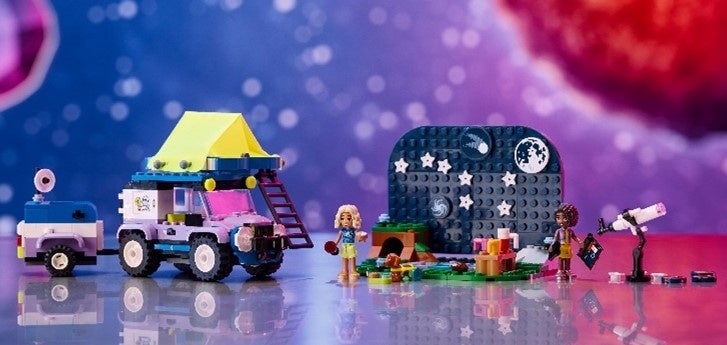 星や惑星のパーツで組み立てた星空の背景にトレーラーと折りたたみ式テントが付いたオフロード車や望遠鏡、付属のミニドールフィギュア2体とイヌとハリネズミのどうぶつフィギュアを組み合わせて“ごっこ遊び”を楽しめます。