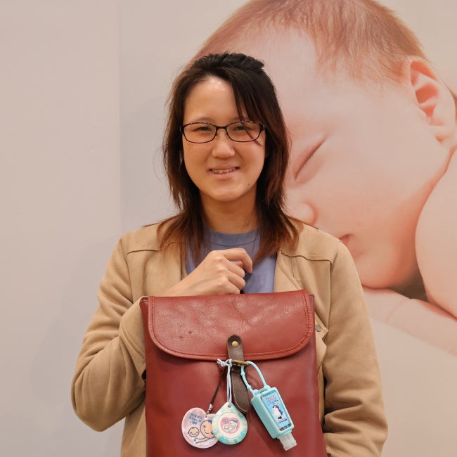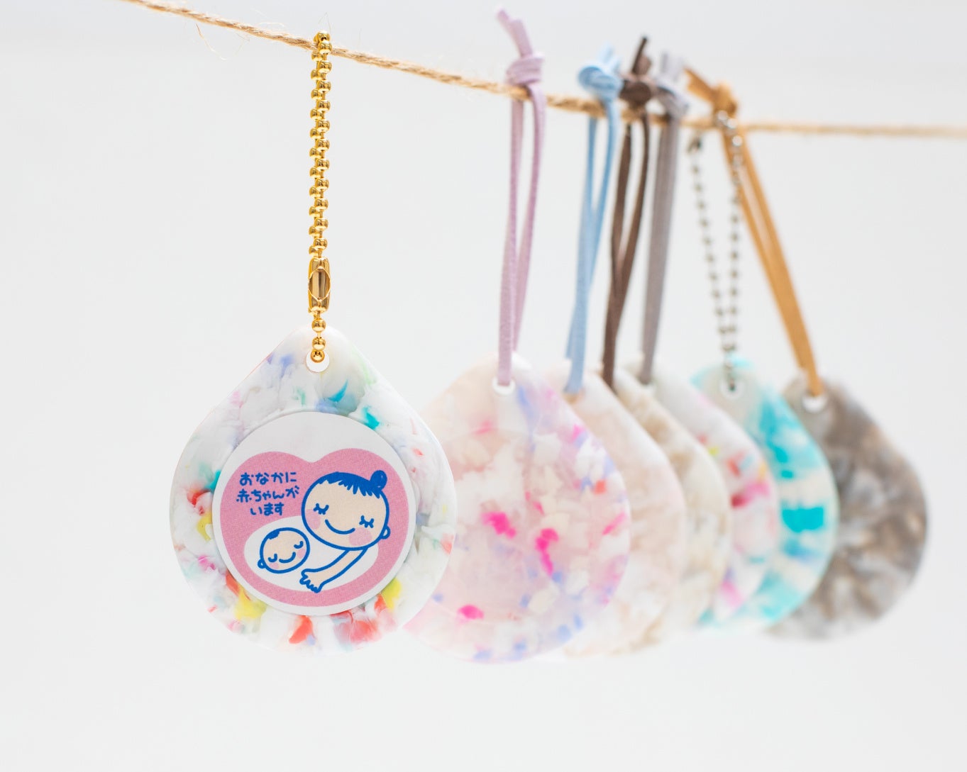 マタニティマークを受け取られた木下さん(妊娠8ヵ月)は、「哺乳びんにはこれまで回収リサイクルの仕組みがなく、ほとんどがゴミとして処分されていたことを初めて知り驚きました。リサイクルできるのは、とても良いことで、素敵な取り組みだと思います。回収した哺乳びんから作られたマタニティマークもとってもかわいいです。」とセレモニー後にワークショップで作ったマタニティマークを早速ご自身の鞄につけていました。