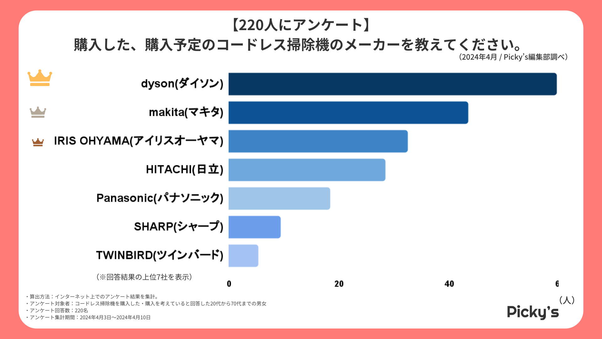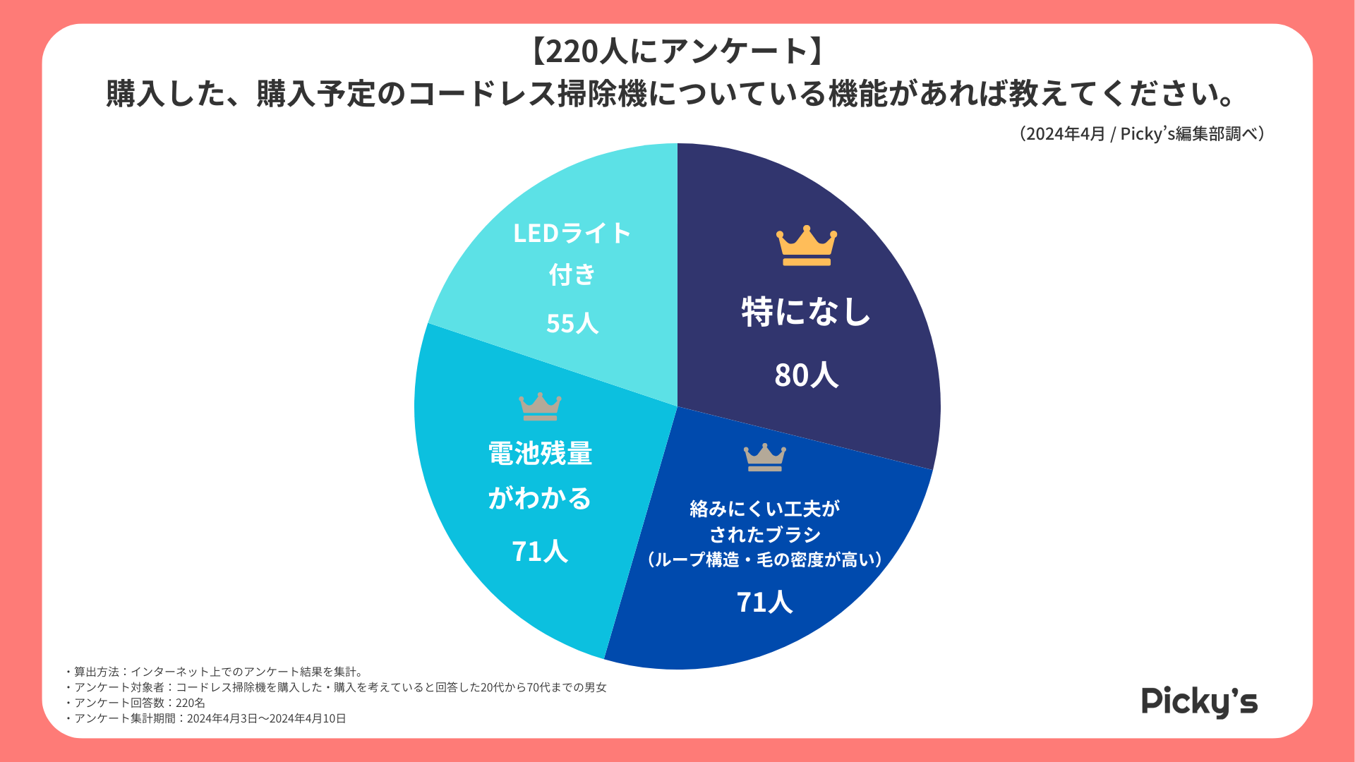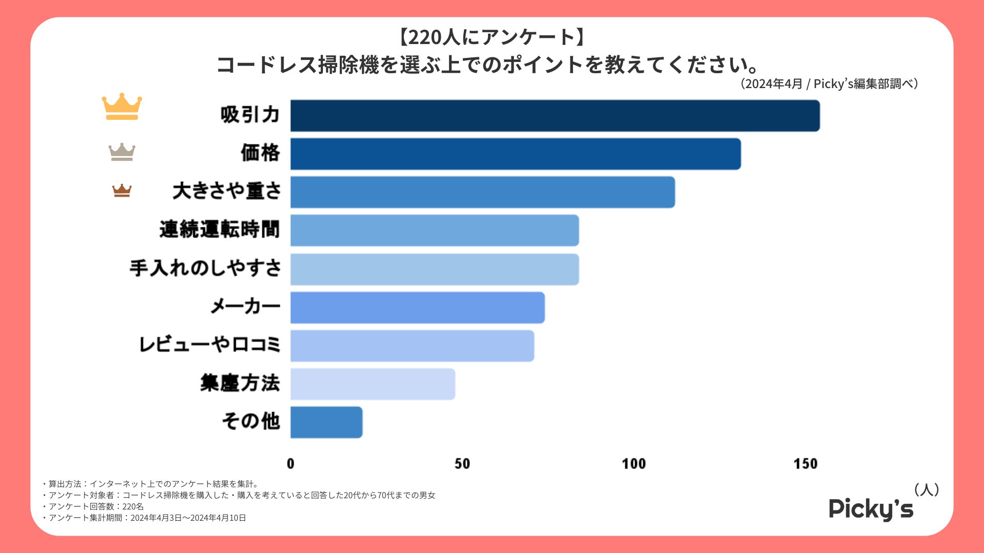 「Picky’s」は、インターネットショッピングにおいて、購入前に試せない・選ぶべきものがわからないという課題の解決を目標に、あらゆる商品のおすすめランキングや検証レビューを紹介するサイトです。このたびPicky’s(https://rentry.jp/)では、春の新生活に先駆けて、コードレス掃除機についてインターネット上でアンケート調査を行いましたので発表いたします。
