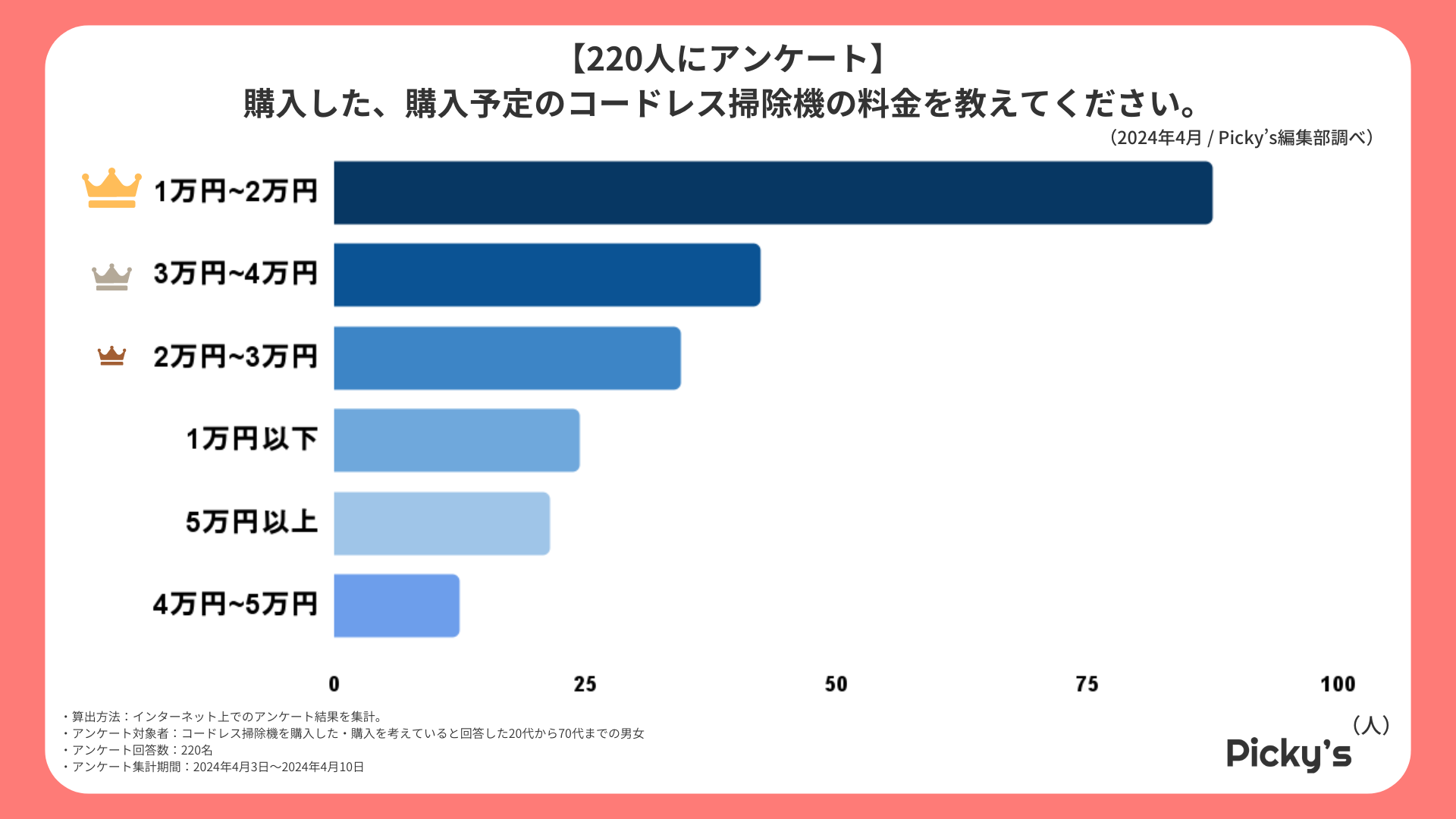 先ほどの選ぶポイントで2番目に回答が多かった「価格」。アンケート調査の結果、「1万円~2万円」の価格帯の回答が最も選ばれました。次に多かった回答は「3万円~4万円」「2万円~3万円」であることから、全体的に中価格帯よりの低価格帯が選ばれるようです。