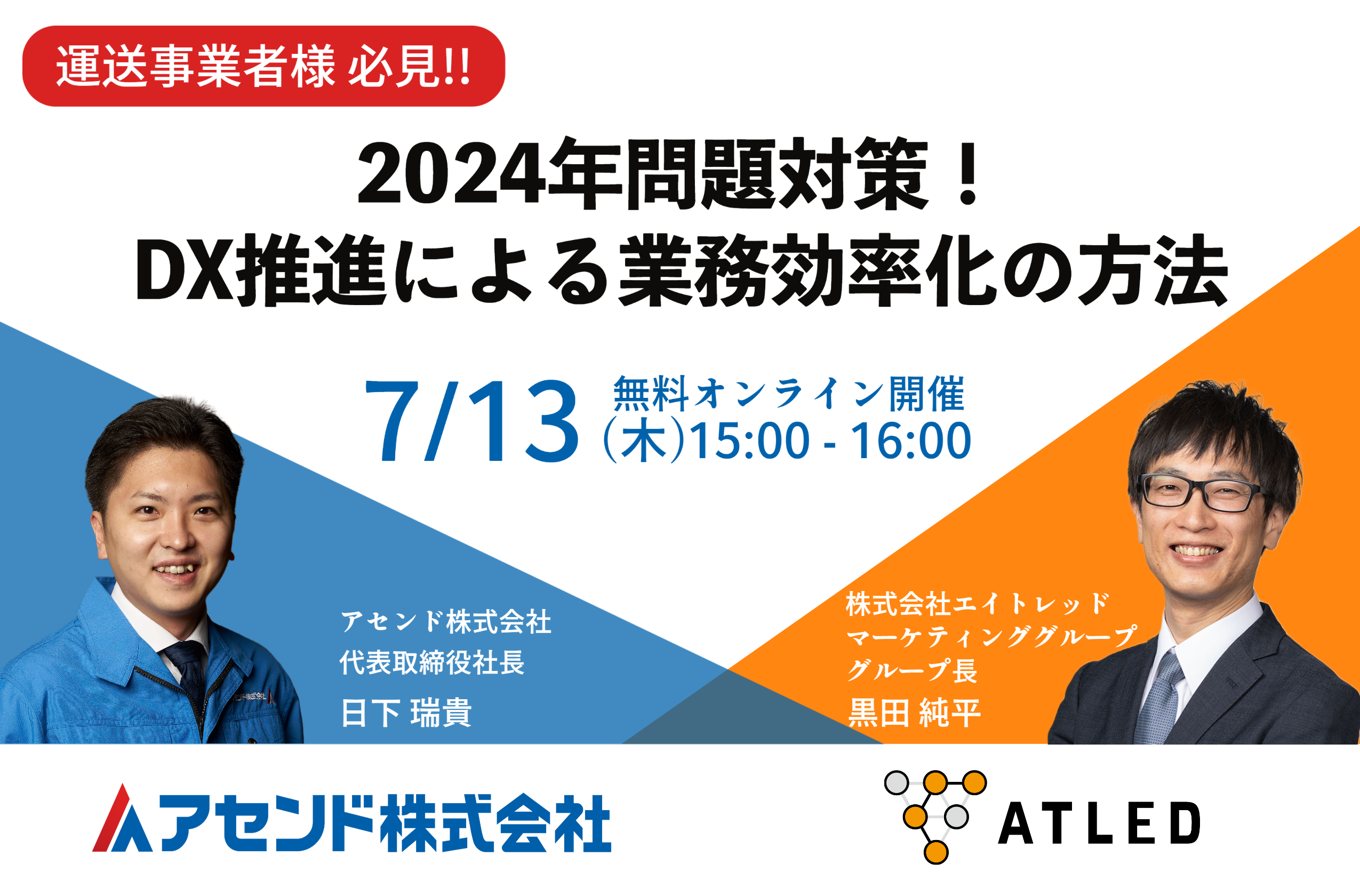 そこで、同セミナーでは、紙・Excel業務をデジタルに変えていく方法、そしてなぜ「2024年問題」を目前にして切り替えるべきなのかを、運送管理saasで物流DXを推進するアセンド株式会社と、ワークフローシステムでバックオフィスDXを推し進める株式会社エイトレッドが、運送会社様のDX実践事例を交えてお伝えします。