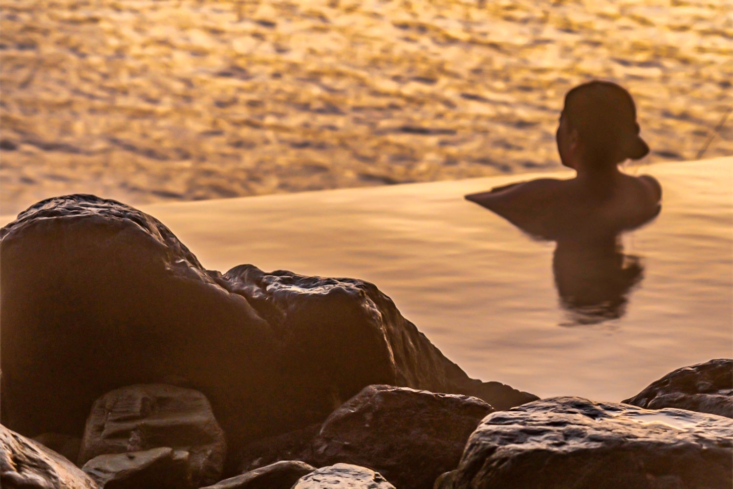 良質な天然温泉に満ちる露天風呂はまるで海に浸かっているかのような圧倒的な開放感。
