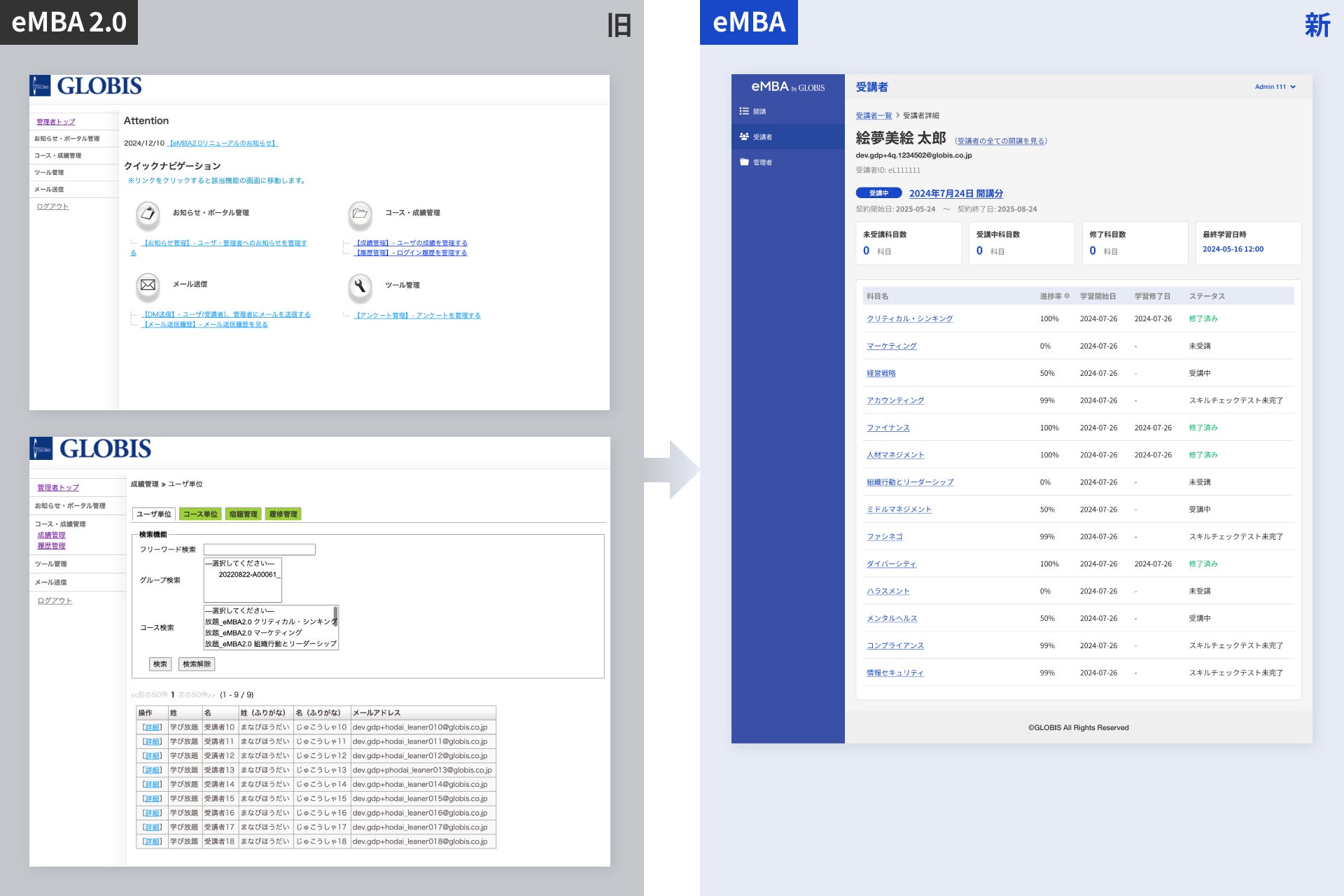 また、リニューアルにより「eMBA」の管理画面が「GLOBIS 学び放題」の管理画面と近いデザイン・操作性となったため、両サービスを利用する人材育成担当者にとって、社員受講履歴の管理がよりシームレスに行えるようになりました。