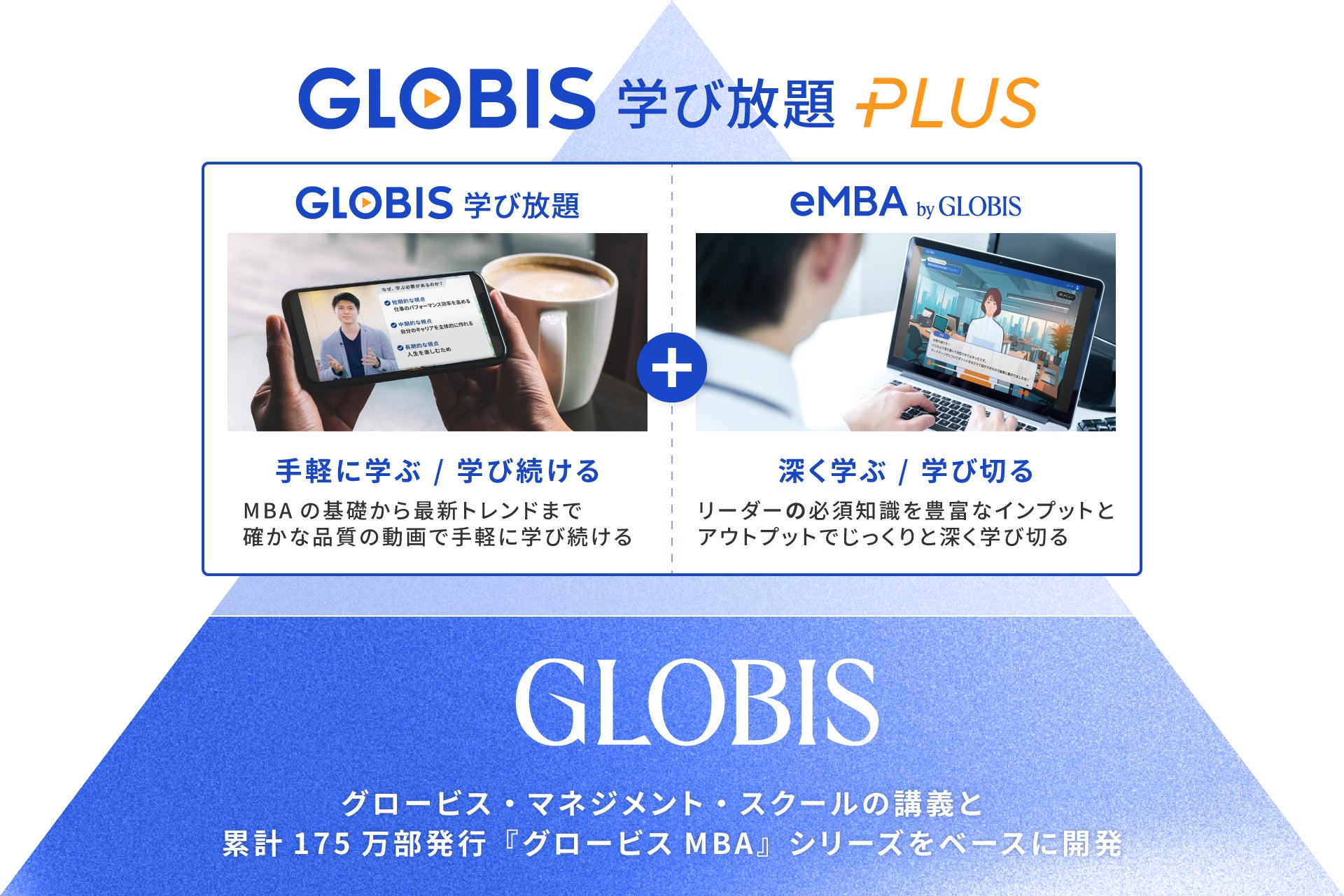 「GLOBIS 学び放題 プラス」は、動画学習サービス「GLOBIS 学び放題」に加え、「eMBA」の全14科目をいくつでも学べるサービスです*1。