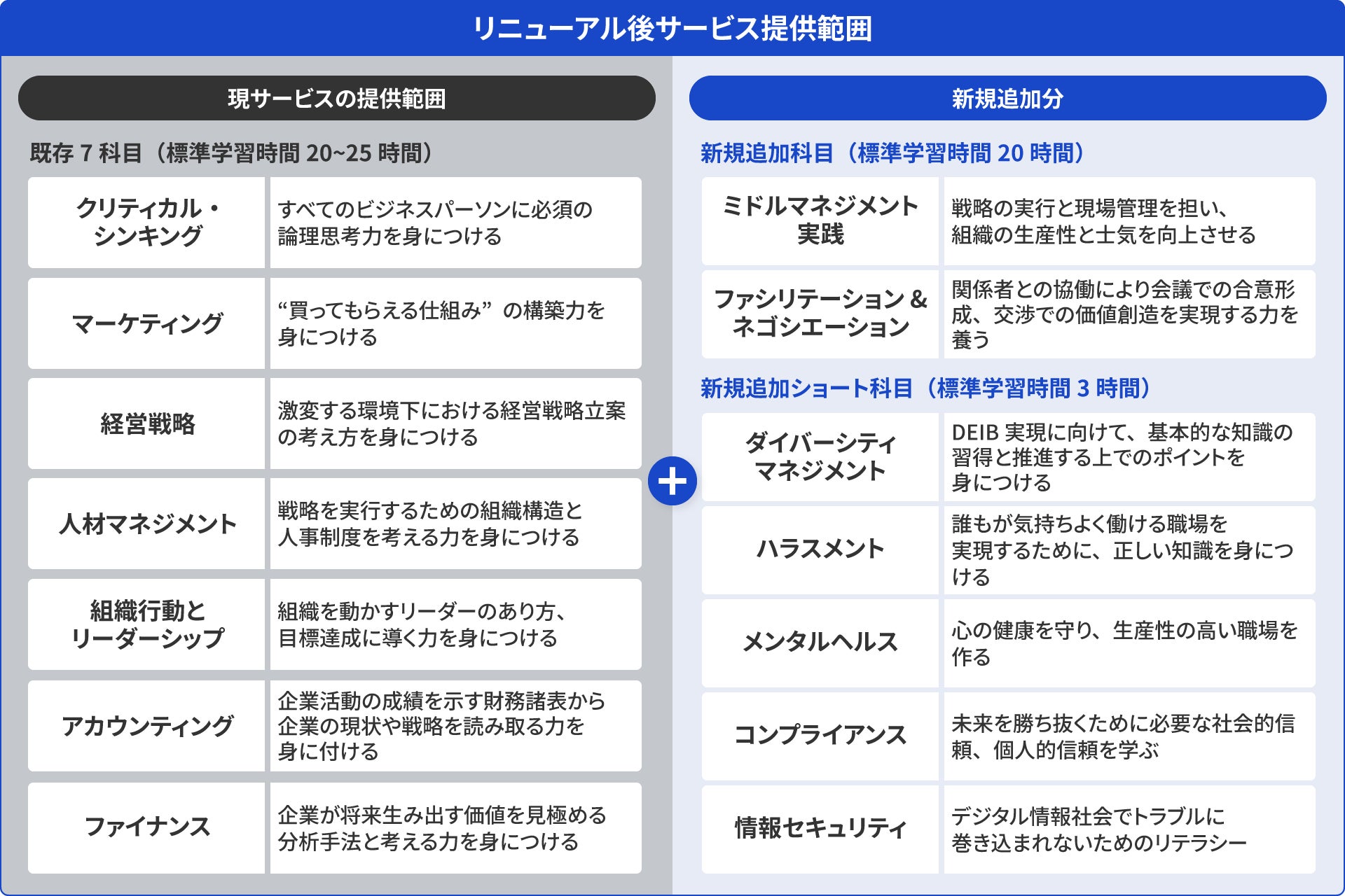 この度のリニューアルで「eMBA」は、MBAの基礎的な知識をカバーした7科目の内容を見直し。学びのポイントや1科目あたりの学習時間目安(20時間)はそのままに、現代のビジネスに即した表現に更新。また、「ミドルマネジメント実践」「ファシリテーション&ネゴシエーション」の2科目を追加しました。さらに、 社員教育において需要の高い「コンプライアンス」「ハラスメント」などを短時間(学習時間目安 3時間)で学べる5つのショート科目を追加しました(図3)。