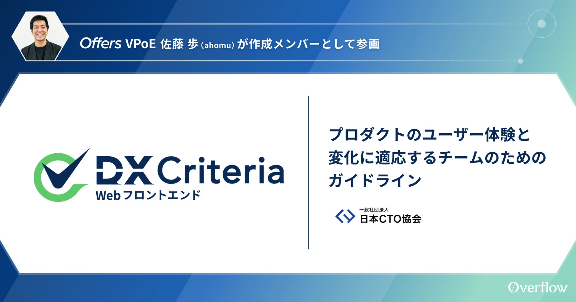 エンジニア、PM、デザイナーの副業・転職サービス「Offers(オファーズ)」を運営する株式会社overflow(本社:東京都港区、代表取締役: 鈴木裕斗・田中慎 以下、overflow)は、一般社団法人 日本CTO協会(本社:東京都渋谷区/代表理事:松岡剛志、以下:日本CTO協会)が公開した「プロダクトのユーザー体験と変化に適応するチームのためのガイドライン『Webフロントエンド版DX Criteria』」の作成メンバーとして、当社VPoE(Vice President of Engineering)の佐藤歩が参画したことをお知らせいたします。
