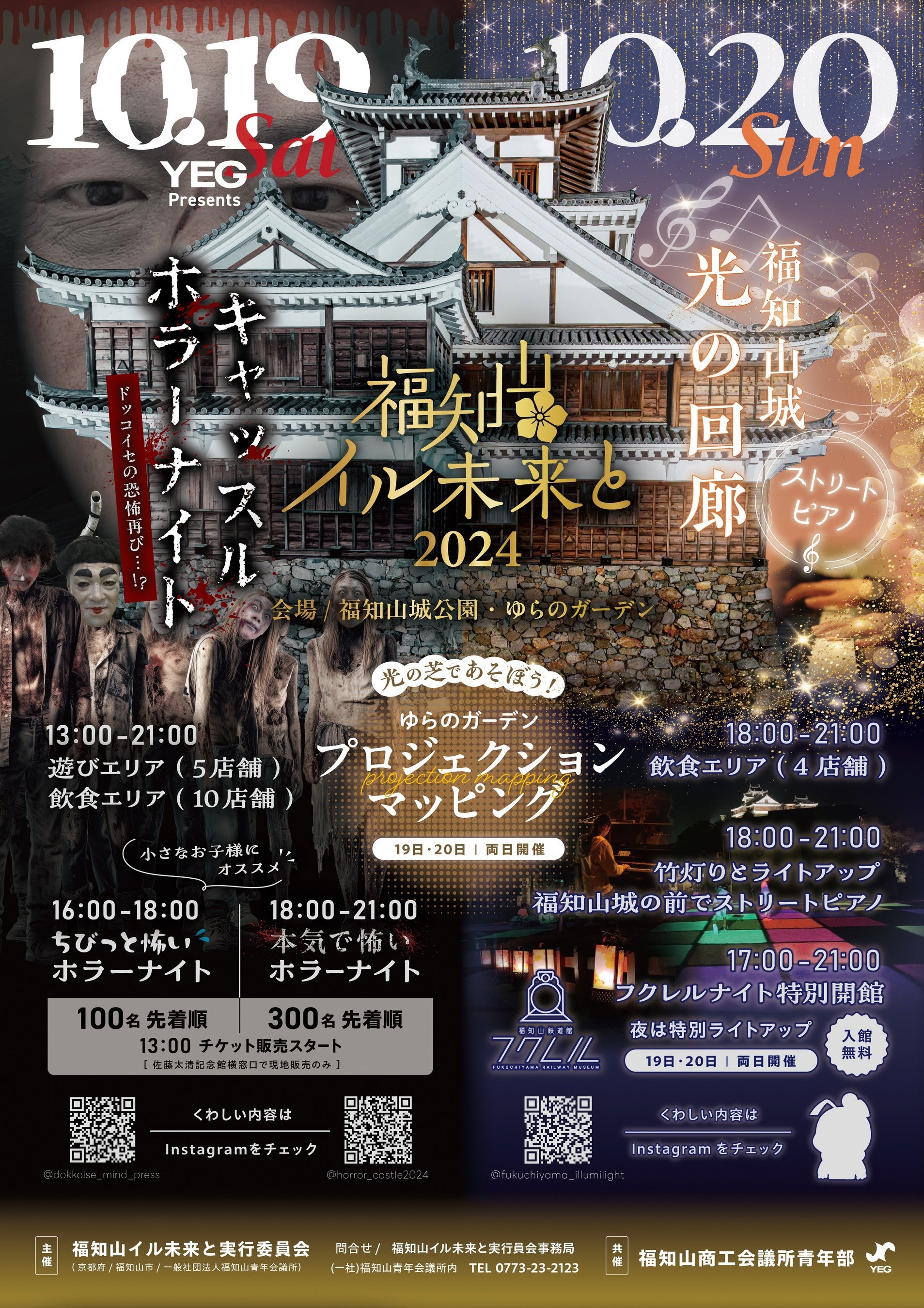 今年の福知山イル未来と2024は2日開催!福知山城前のゆらのガーデンでは体感型プロジェクションマッピングが芝生に映し出されます。19日は福知山YEGによる福知山城全体を使ったキャッスルホラーナイトやハロウィンイベントが盛りだくさん!20日はストリートピアノや灯篭、ライトアップで秋の夜長を光と音楽で楽しんでいただけます。詳しくはイル未来とインスタグラムをご覧ください。