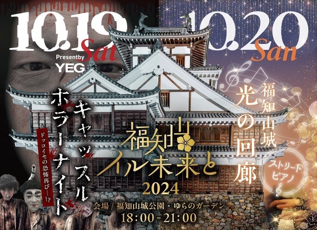 福知山城のふもとに位置するゆらのガーデンでは、体感型プロジェクションマッピングが芝生に映し出され、会場を光で演出します。福知山城では、2日間で異なるイベントを開催。1日目は、昨年1万人が来場するなど大反響をいただいたお城を舞台としたお化け屋敷ハロウィンイベント「キャッスルホラーナイト」を今年も開催いたします。2日目は一転その姿を変えて、福知山城を竹灯籠の優しい灯りで彩る光の回廊やお城正面にストリートピアノを設置するなど様々なイベントを開催します。