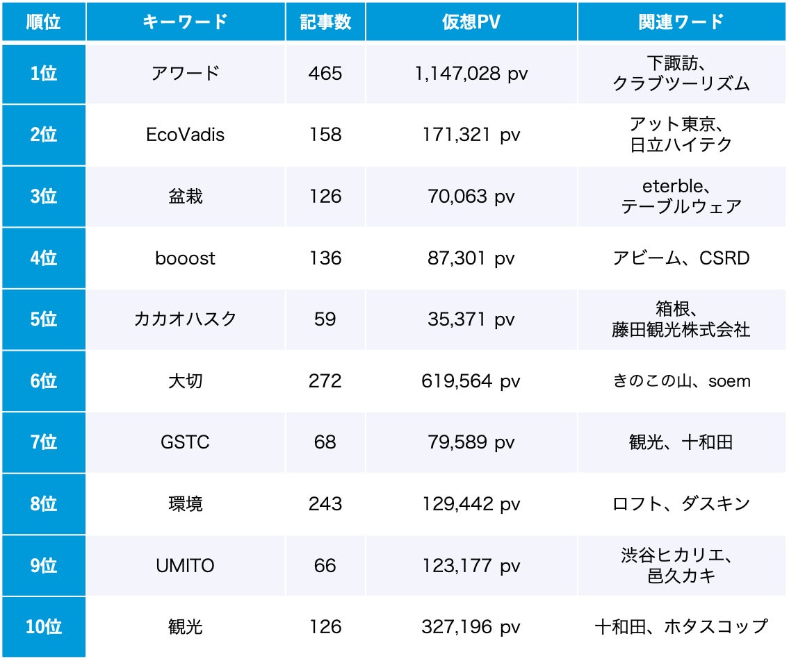 1位「アワード」では上記の「ESGファイナンス・アワード・ジャパン」の環境サステナブル企業部門や「サステナブルコスメアワード」関連の情報がありますが、パブリシティがとくに多いのが観光庁「サステナブルな旅アワード」の話題です。