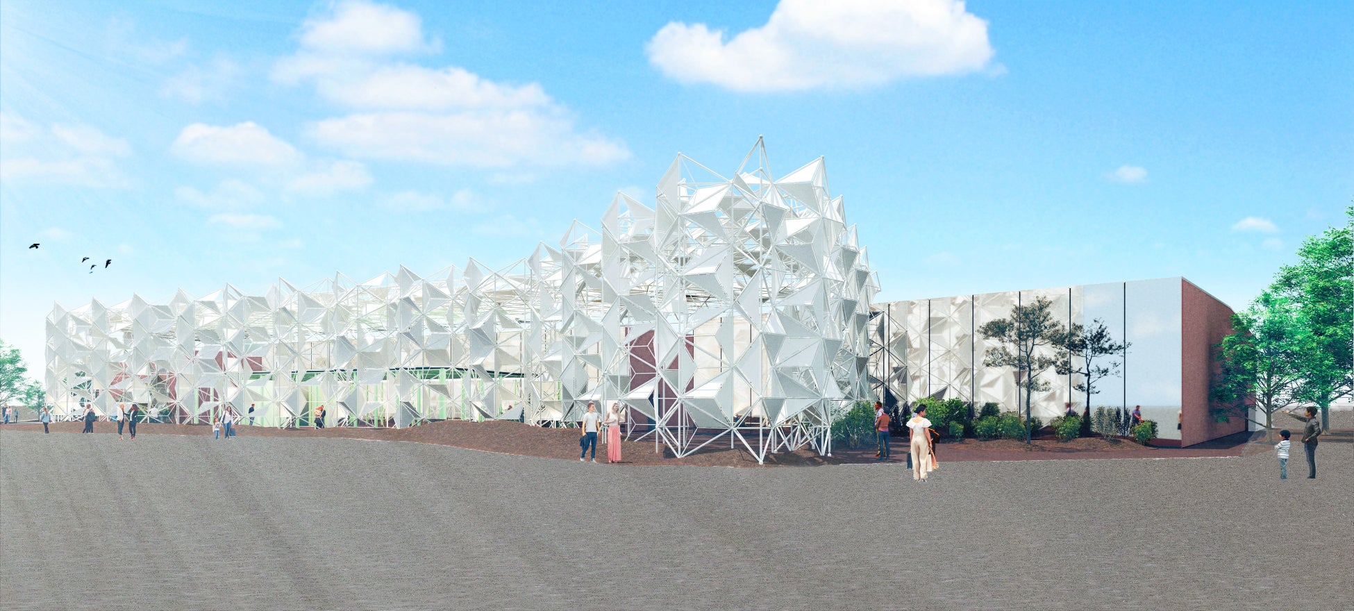 (仮称)屋内出展施設には、2020年ドバイ国際博覧会の日本館で使用されたのち、2025年の大阪・関西万博の「ウーマンズ パビリオン in collaboration with Cartier」でも使用されたファサード資材がリユースされます。