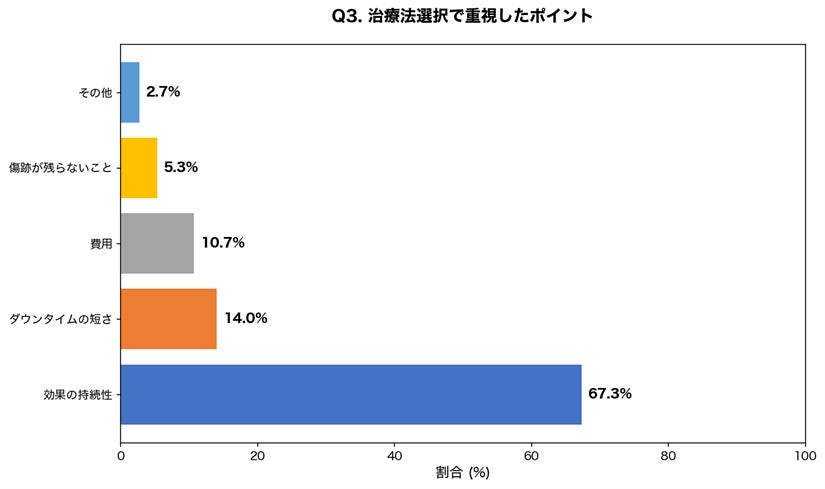 「効果の持続性」を最も重視した方が67.3%と圧倒的に多く、費用やダウンタイムよりも確実な効果を求める傾向が明らかになりました。再発リスクの低い治療法への関心の高さがうかがえます。