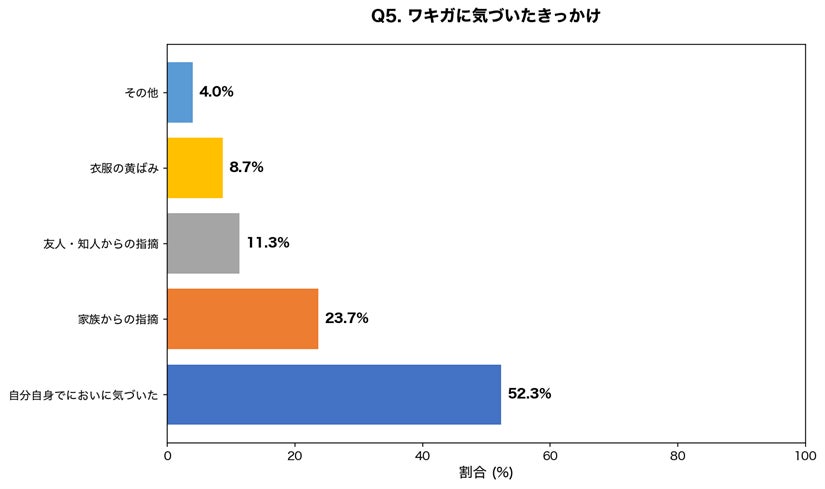 52.3%が自分自身でにおいに気づいており、セルフチェックの重要性が示されました。一方で、約35%は他者からの指摘がきっかけとなっており、においの問題は本人が気づきにくいケースも少なくないことがわかります。