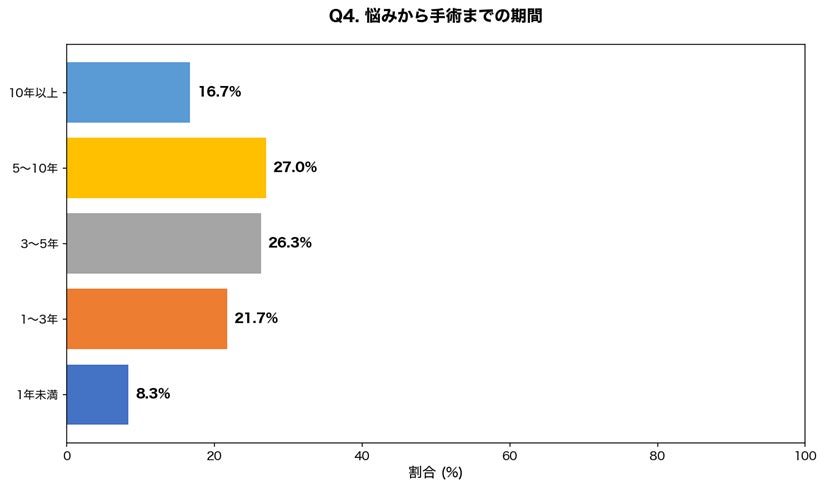 43.7%の方が5年以上悩みを抱えてから手術を決断しており、治療への心理的ハードルの高さがうかがえます。Q2の結果と合わせると、早期相談・早期治療の重要性が浮き彫りになっています。
