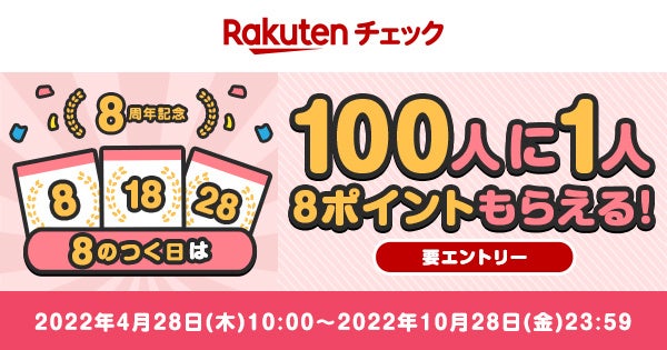 ・キャンペーン内容: キャンペーン期間中にエントリーの上、8のつく日に「楽天チェック」アプリでお店や公園にチェックインした人の中から抽選で100人に1人「楽天ポイント」8ポイントを進呈します。
