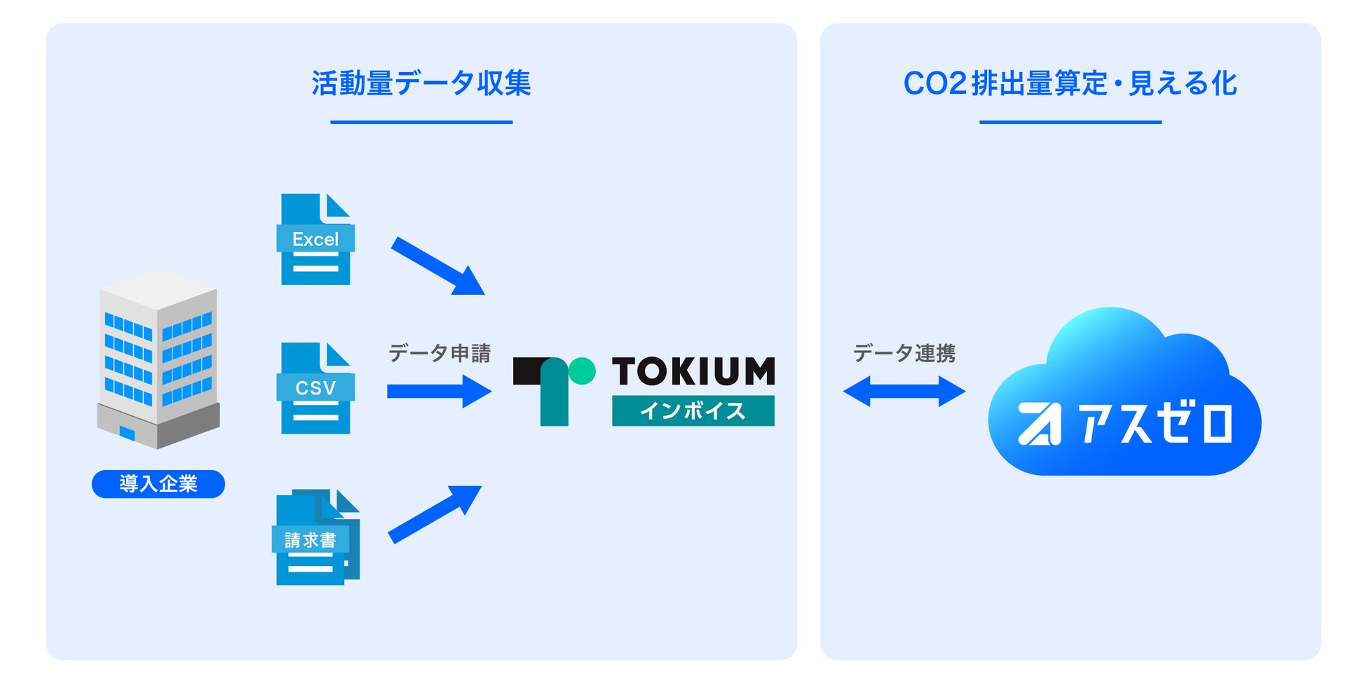 CO2排出量見える化・削減クラウドサービス「アスゼロ」を提供するアスエネ株式会社(本社:東京都港区、代表取締役CEO:西和田 浩平、以下「当社」)は、株式会社TOKIUM(本社:東京都千代田区、代表取締役:黒﨑 賢一、以下「TOKIUM」)と業務提携しました。TOKIUMインボイスとのデータ連携により、CO2排出量をさらにカンタンに見える化することが可能となります。