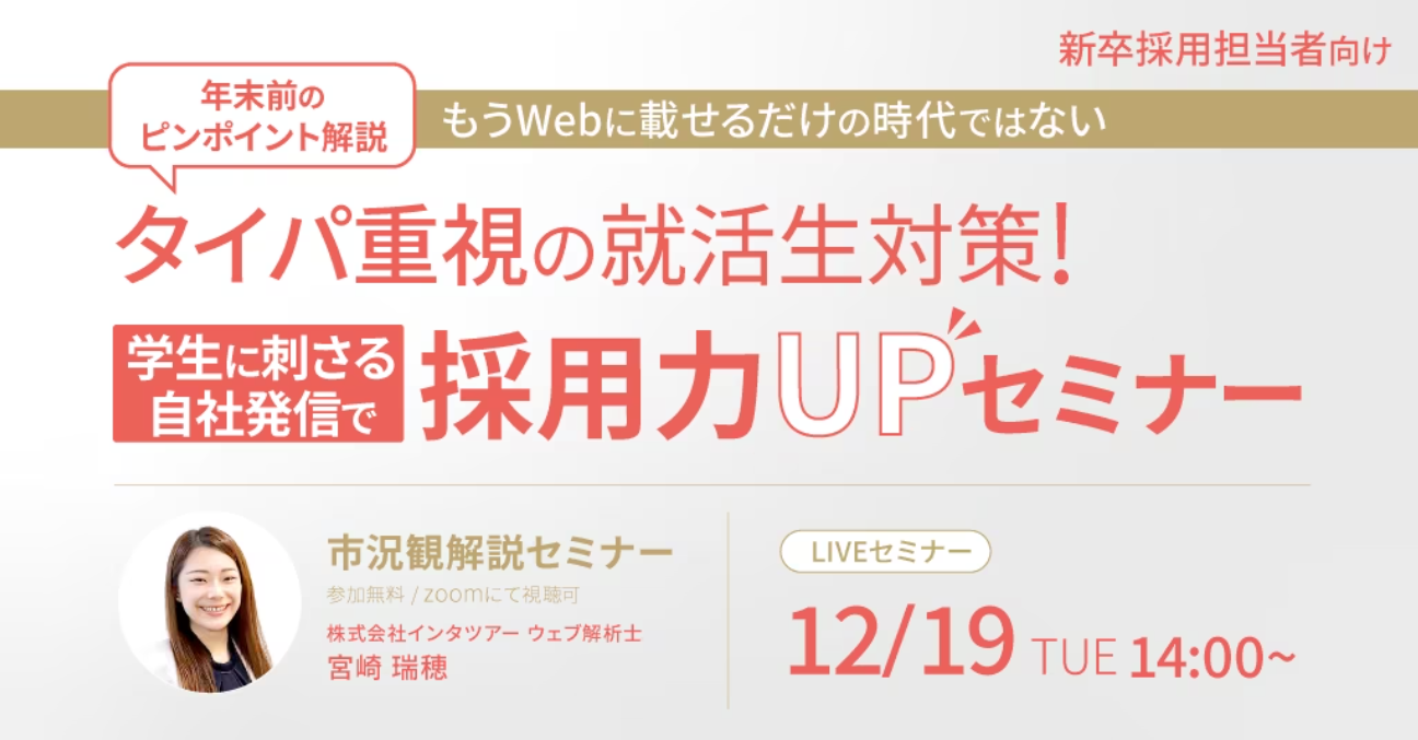 タイトル:年末前のピンポイント解説 もうWebに載せるだけの時代ではない タイパ重視の就活生対策!学生に刺さる自社発信で採用力UPセミナー