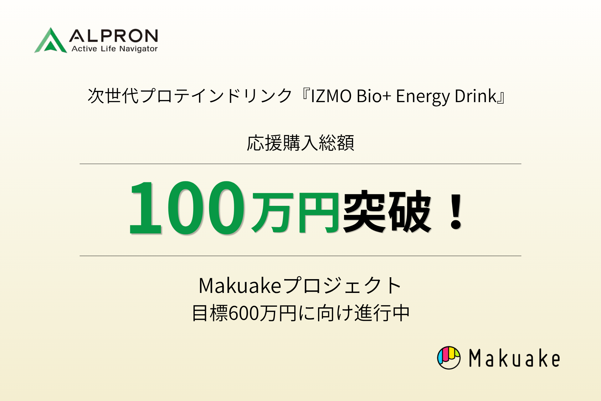 プロテイン・スポーツ栄養食品の製造販売を行う株式会社アルプロン(本社:島根県雲南市、代表取締役社長:坂本 雅俊、以下 アルプロン)は、本田技研工業株式会社(以下 Honda)が開発した「Honda DREAMO(ホンダ ドリーモ)」を採用した新商品『IZMO Bio+ Energy Drink』について、応援購入サービス「Makuake」で実施中のプロジェクトにおける応援購入総額が100万円を突破したことをお知らせいたします。