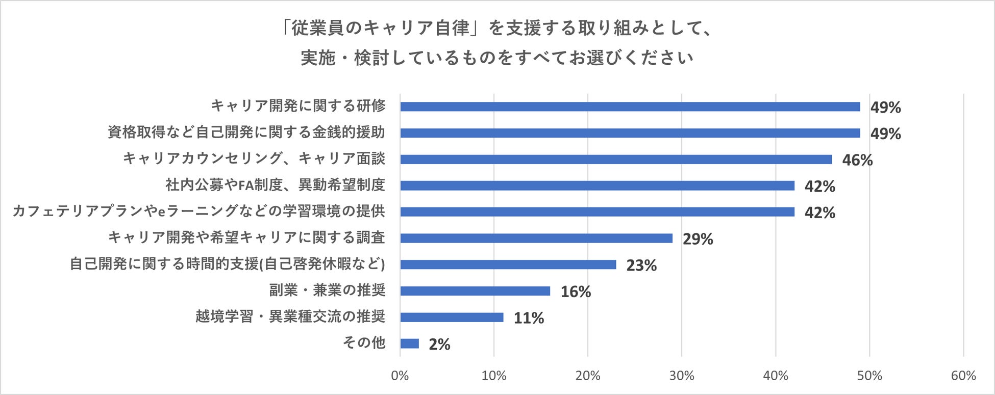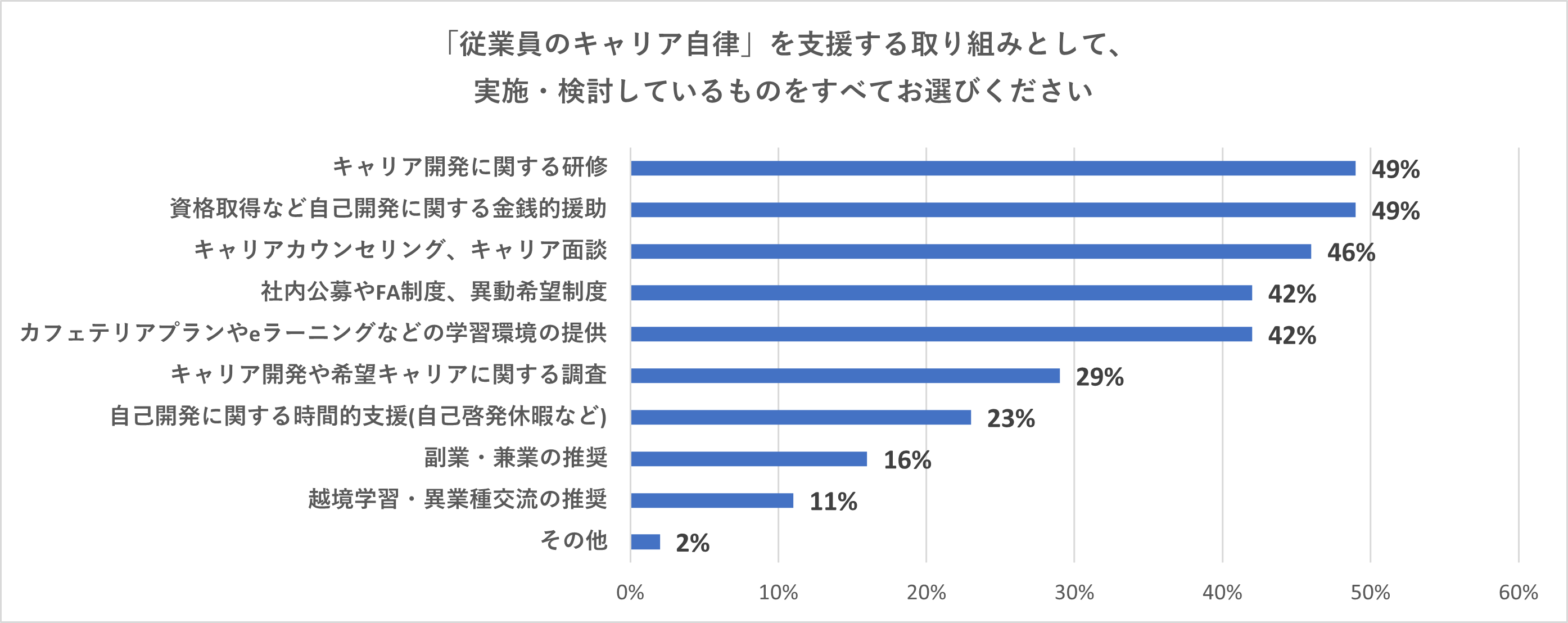 「従業員のキャリア自律を支援する取り組みとして、実施・検討しているもの」について質問したところ、「キャリア開発に関する研修」、「資格取得など自己開発に関する金銭的援助」の回答が49%とトップ、次いで「キャリアカウンセリング・キャリア面談」が46%となりました。