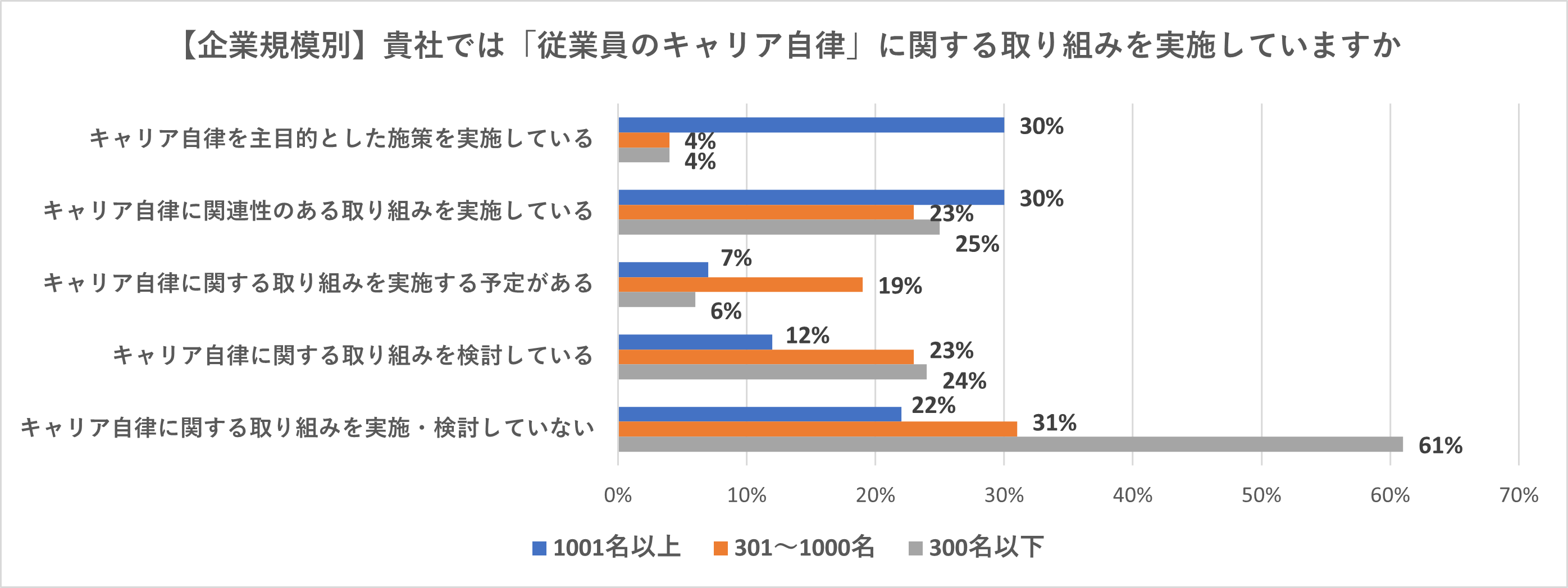 「従業員のキャリア自律に関する取り組み」について質問したところ、従業員が1001名以上の企業では「キャリア自律を主目的とした施策を実施している」が30%、「キャリア自律に関連性のある取り組みを実施している」が30%となり、合計60%の企業が既に何らかの取り組みを実施していることが分かりました。