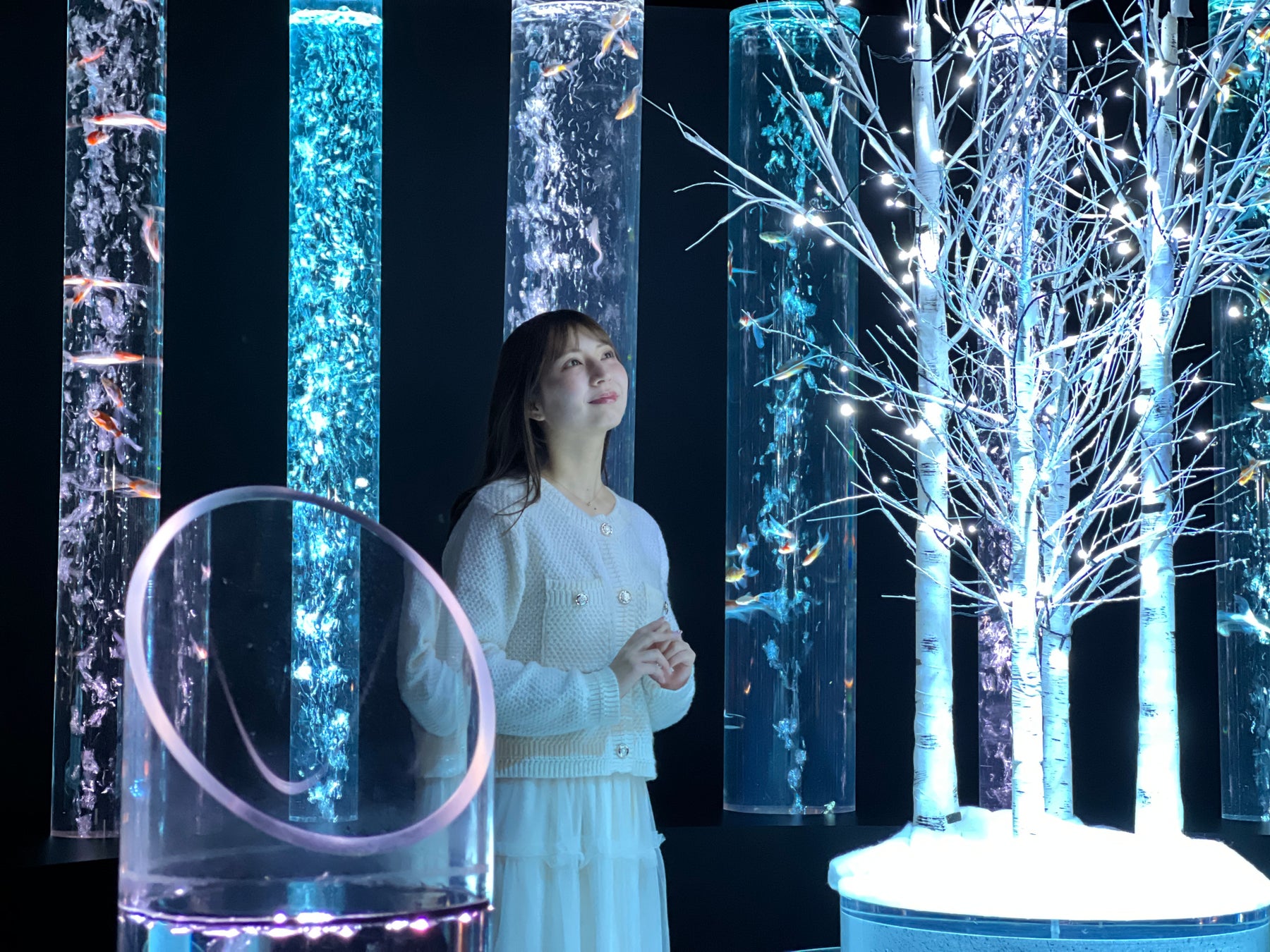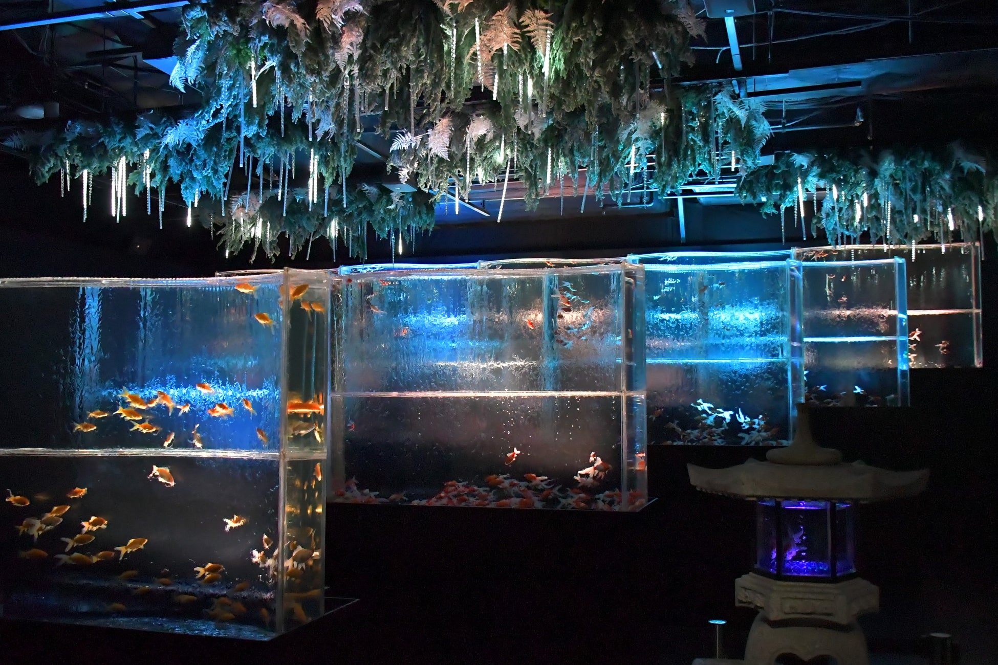 光・音・香の幻想的な空間と、そのなかを泳ぐ金魚の優雅な姿は、都会の喧騒を忘れさせ、心安らぐひとときを演出します。幻想的なアート空間で、ここだけの特別な冬景色をぜひご体験ください。