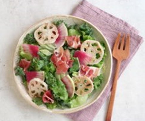 ②お皿に「旬を味わうサラダ 紅芯大根やケール」を盛り、①、生ハムを盛りつけドレッシングをかけ