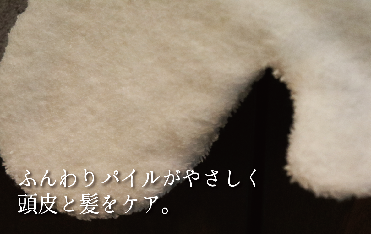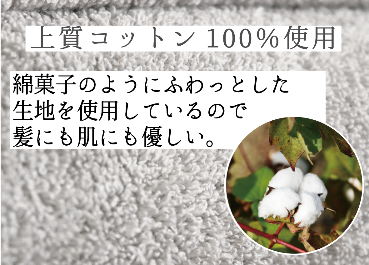 綿100%だから髪に優しい!ゴシゴシこすらなくてもサッと吸水。敏感な肌やキューティクルが柔らかくなった髪もやさしく拭きあげます。