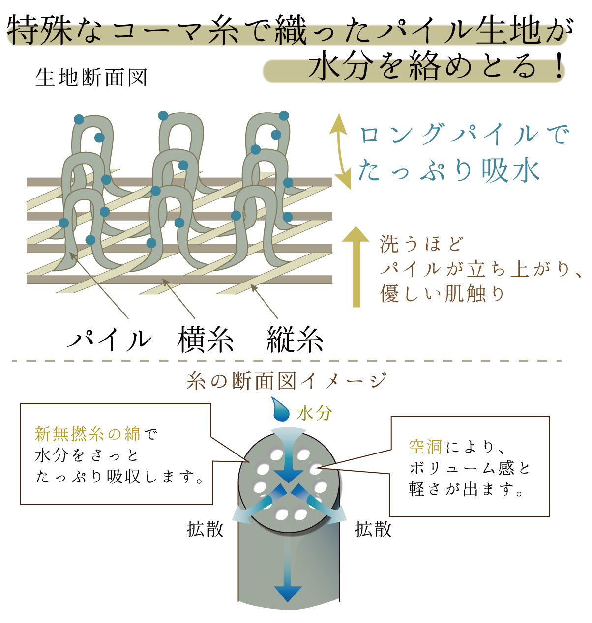 糸から一新!吸水性や髪のやさしさのために開発したコーマ糸!