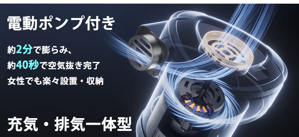 キャンプやアウトドア、急な来客、災害時の避難所など、さまざまなシーンで活躍するマットレスです。電動ポンプ付きで、わずか数分でふかふかの寝床が完成。使わないときはコンパクトに折りたたんで収納できるので、置き場所にも困りません。