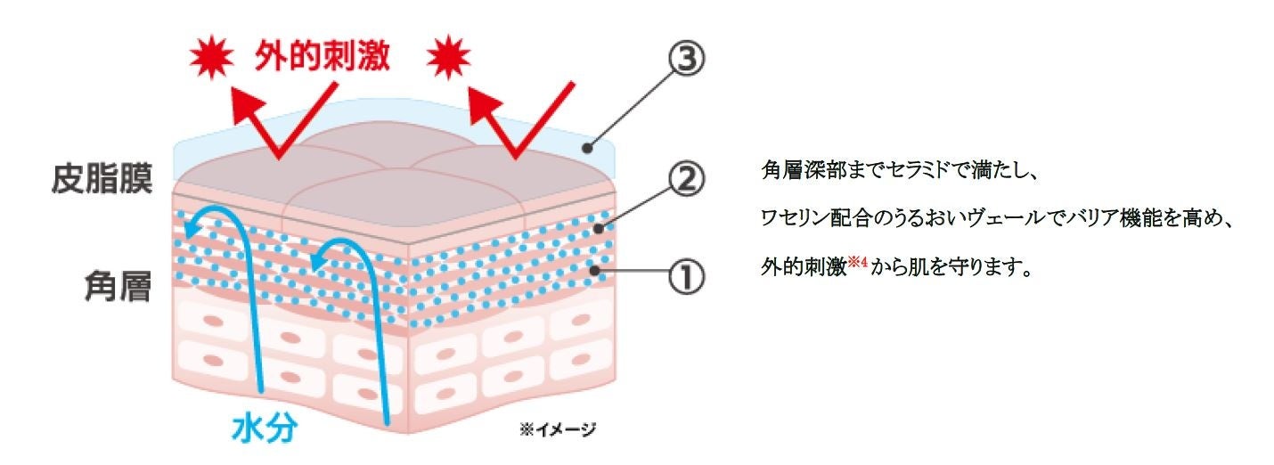 ③ワセリンGL(保湿)配合。肌上にうるおいの膜をつくり、水分が逃げるのを防ぎます。