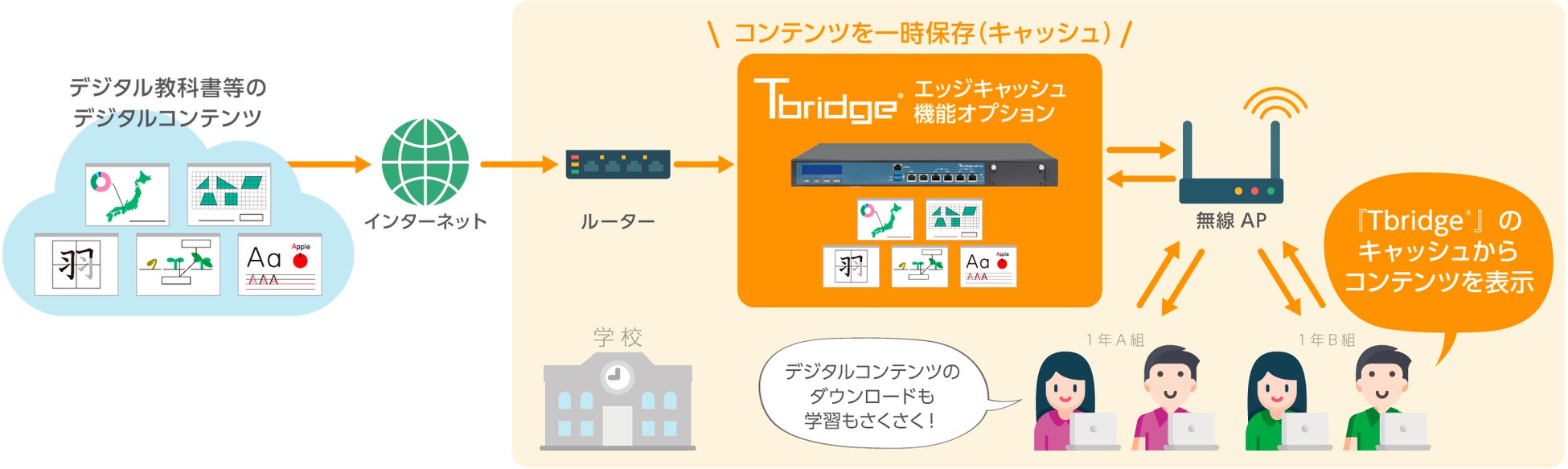 デジタル教科書のコンテンツやOSアップデートデータ等、学級内で同じコンテンツが利用されることが多い環境においては、「エッジキャッシュ機能」が効果的です。Tbridge®内にコンテンツデータを一時保存することで、インターネット回線への負荷を大幅に軽減します。