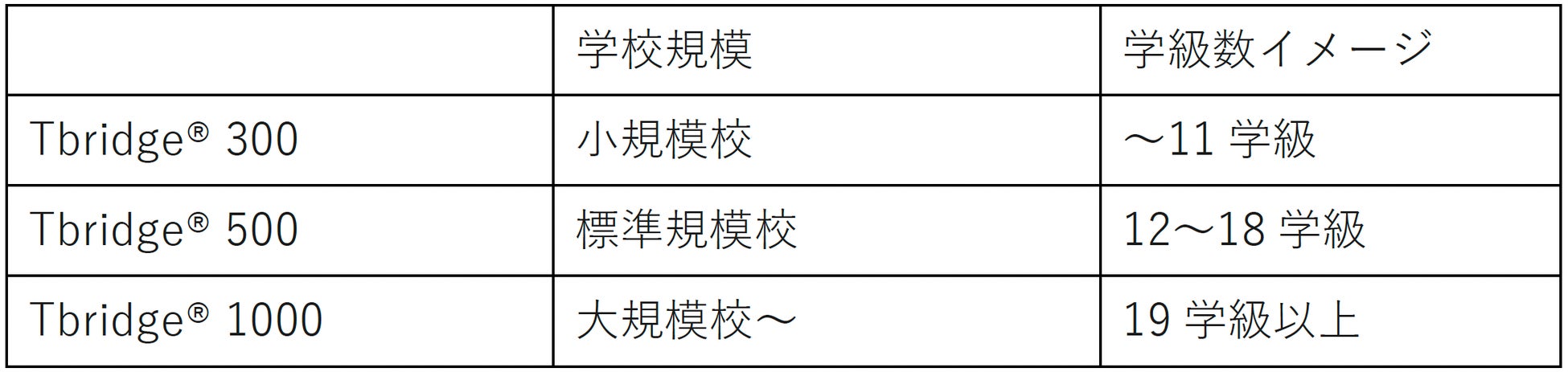 現在、『Tbridge® 300』(小規模校向け)、『Tbridge® 500』(中規模校向け)、『Tbridge® 1000』(大規模校向け)の3モデルを展開しており、学校規模や利用環境に応じた最適なモデルを選択いただけます。