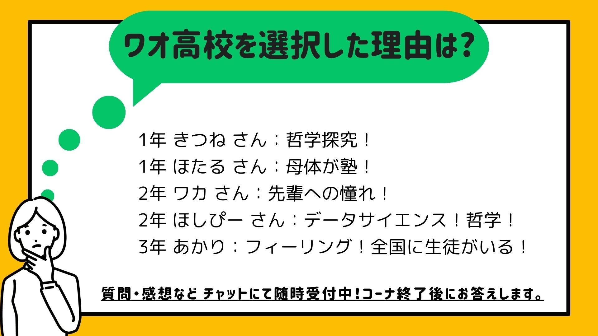 Akariさん:まずは、まだ入学して半年もたっていなくて、記憶が新しい1年生に聞いてみようかな。狐さんがワオ高校を選んだ理由は?