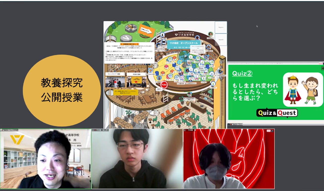 「ワオ高校での学校生活はどんな様子?」「生徒はどうしてワオ高校を選択したのだろう?」「哲学の授業ってオモシロイの?」2024年度のワオ高校オープンスクールは、入学希望者から多く寄せられるこんな疑問に、まるごとお答えする内容となっています。2024年度の第1回となるオープンスクールを、6月1日に開催。初回は、ワオ高生による座談会と公開授業を実施しました。バーチャルキャンパスを訪れてくれた多くの参加者に向け、ワオ高校の魅力を伝えました。
