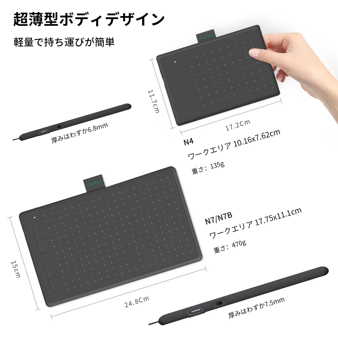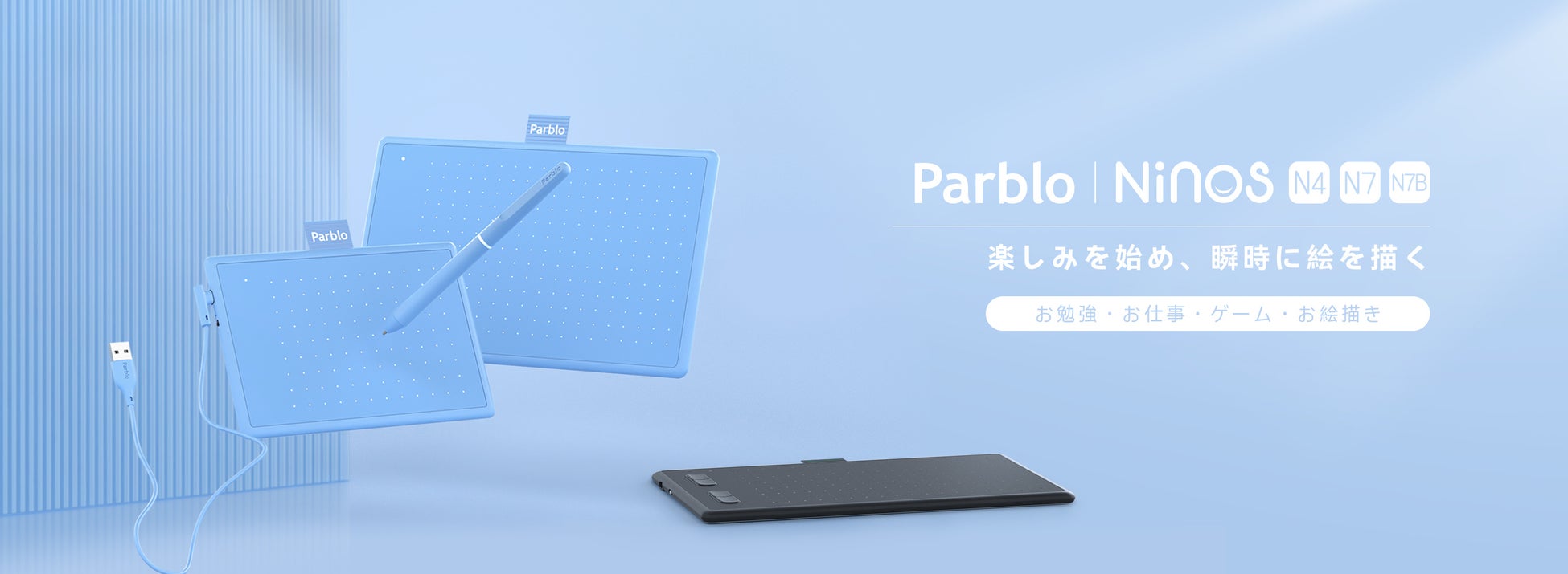 Parblo Ninos Nシリーズのタブレットは、お絵描きの初心者に向け、ワイヤレスバッテリーフリー電磁共鳴ペンテクノロジーを採用し、ニーズに応じてコスパが高いN4/N7/N7B以上3種類の商品を発売しています。