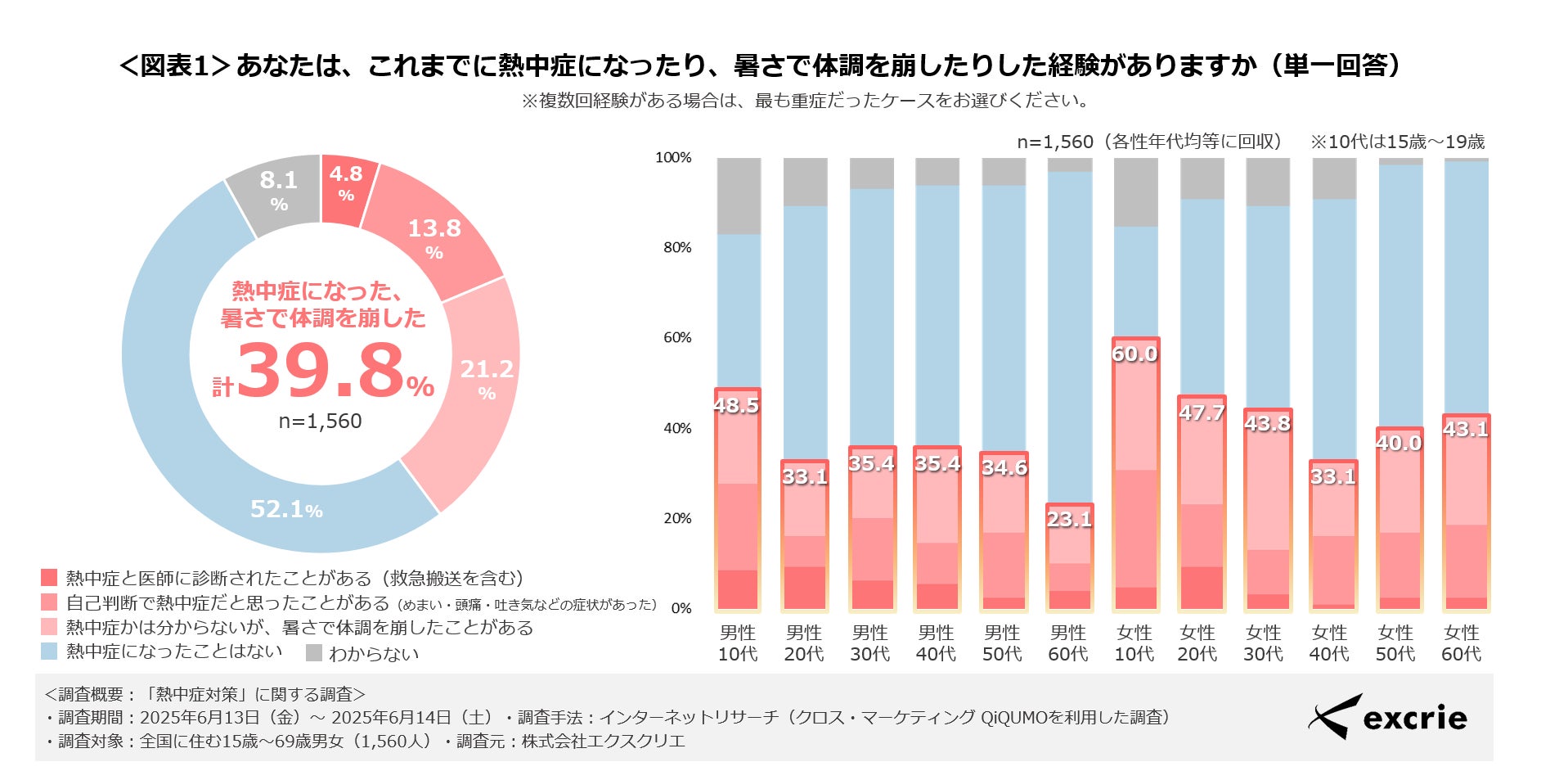株式会社クロス・マーケティンググループ(本社:東京都新宿区、代表取締役社長兼CEO:五十嵐 幹、東証プライム3675)のグループ会社であるソーシャル&セールスプロモーションサービスを展開する株式会社エクスクリエ(本社:東京都新宿区、代表取締役社長:髙栖 祐介)は、インターネットリサーチ(セルフアンケートツール「QiQUMO」を利用した調査)で、全国に住む15歳~69歳男女(1,560人)を対象に「熱中症対策」に関するWebアンケートを2025年6月13日(金)~ 6月14日(土)に実施しました。