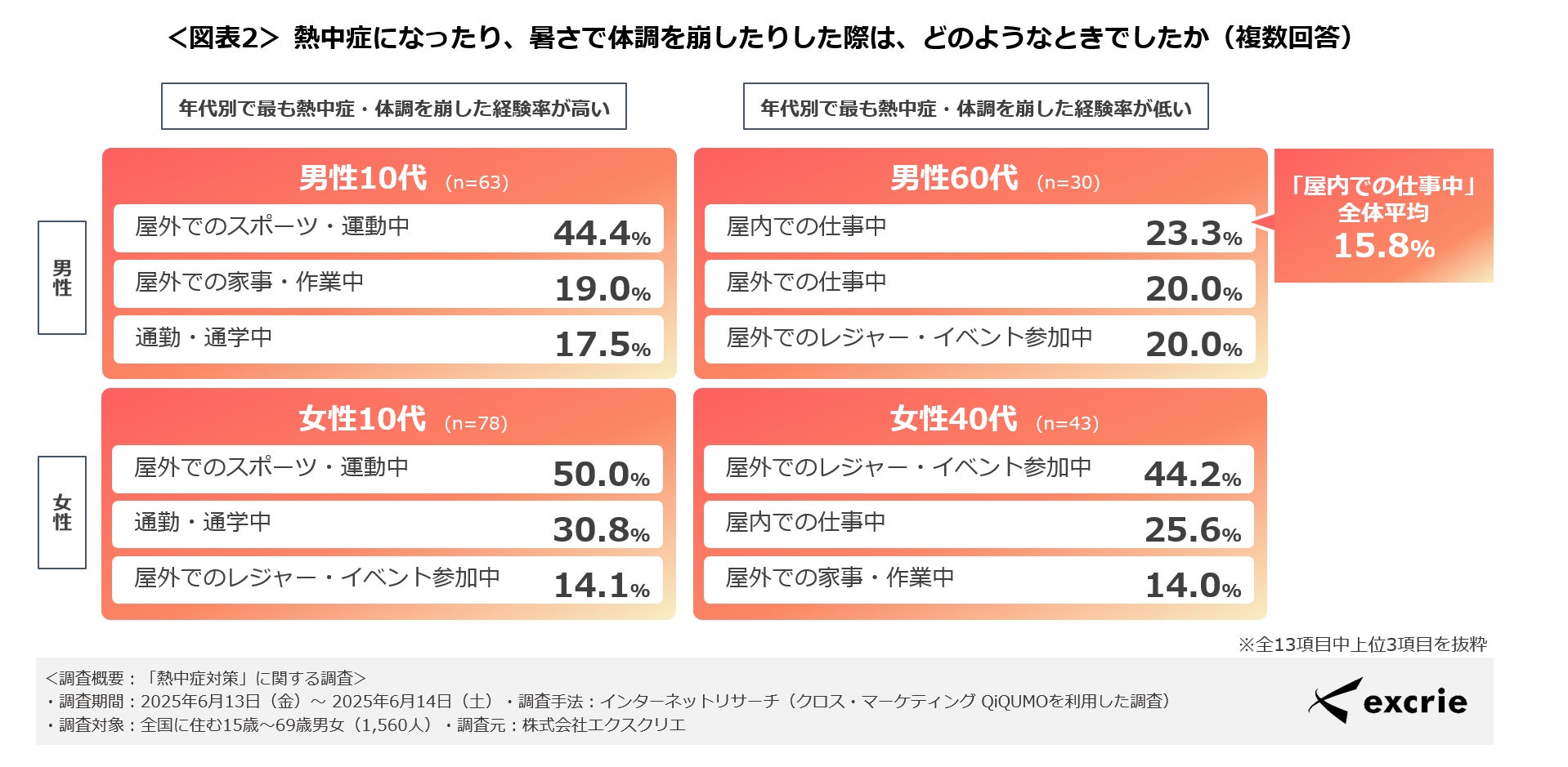 10代が熱中症になったシーンは「屋外でのスポーツ・運動中」が最も多く、「通勤・通学中」も上位に挙がっています。学校への通学途中や屋外での体育の授業、部活動中における熱中症のリスクが高いと考えられます。 一方、中高年層では「屋内での仕事中」に熱中症になった割合が、女性40代では25.6%(全体平均+9.8Pt)、男性60代では23.3%(全体平均+7.5Pt)と比較的高い割合となりました。(図表2)