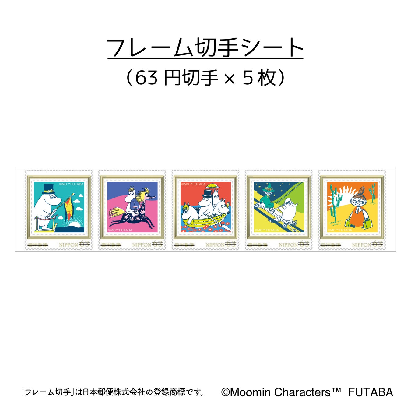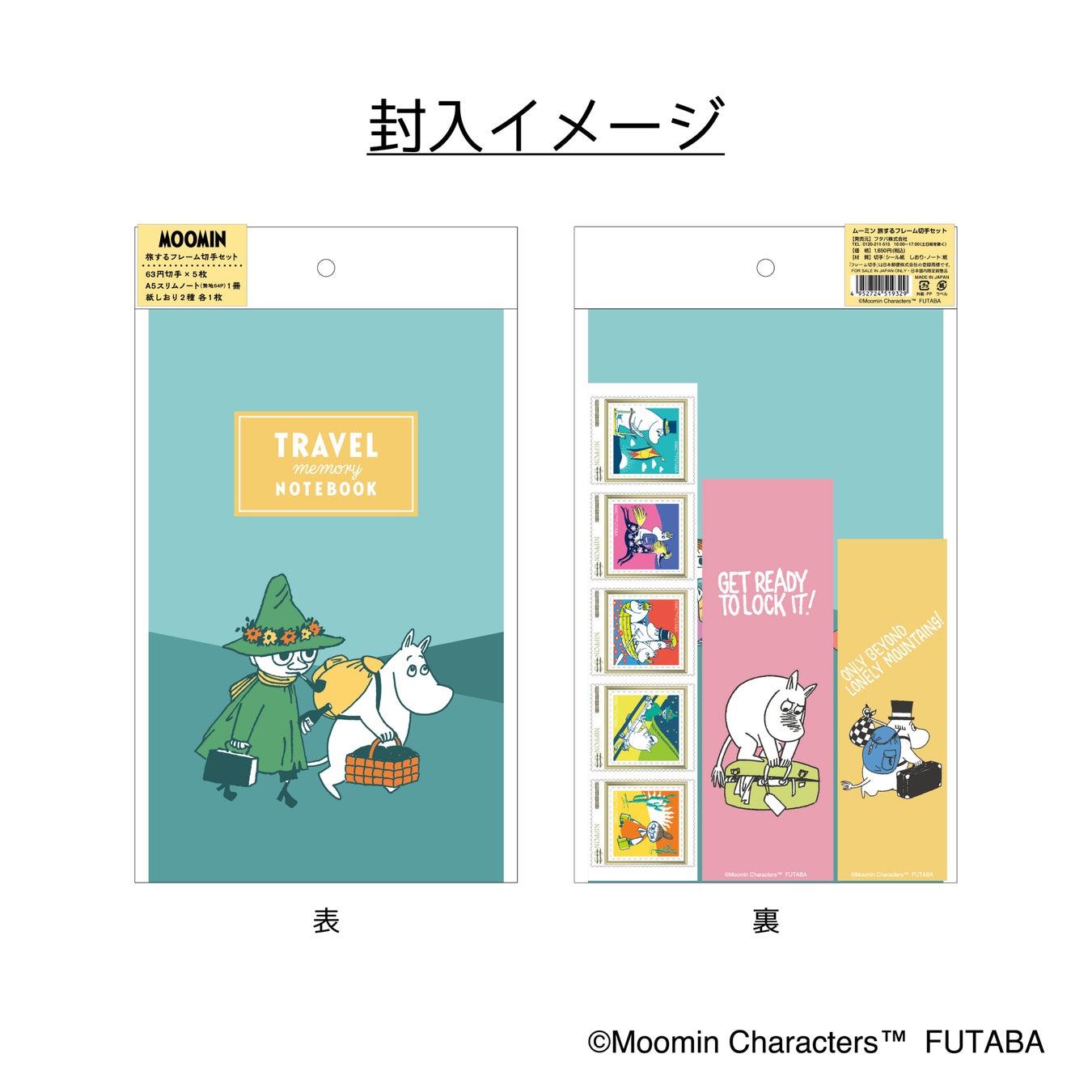 「旅」をテーマにした「ムーミン」たちのフレーム切手5枚と、オシャレで持ち運びに便利な旅ノート、大小のしおり(デザイン2種)がセットになっています。