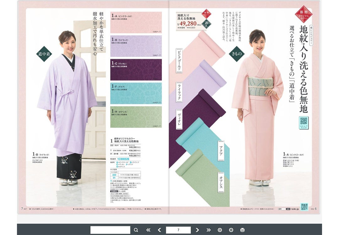 「きもの都粋」では、季節ごとにお勧めの商品をまとめた通販カタログを、年に2回発行しています。掲載商品は公式ネットショップおよび楽天市場にてご購入いただけます。また、全国のグループ店舗でも商品を直接ご覧いただけますので、ぜひご利用ください。