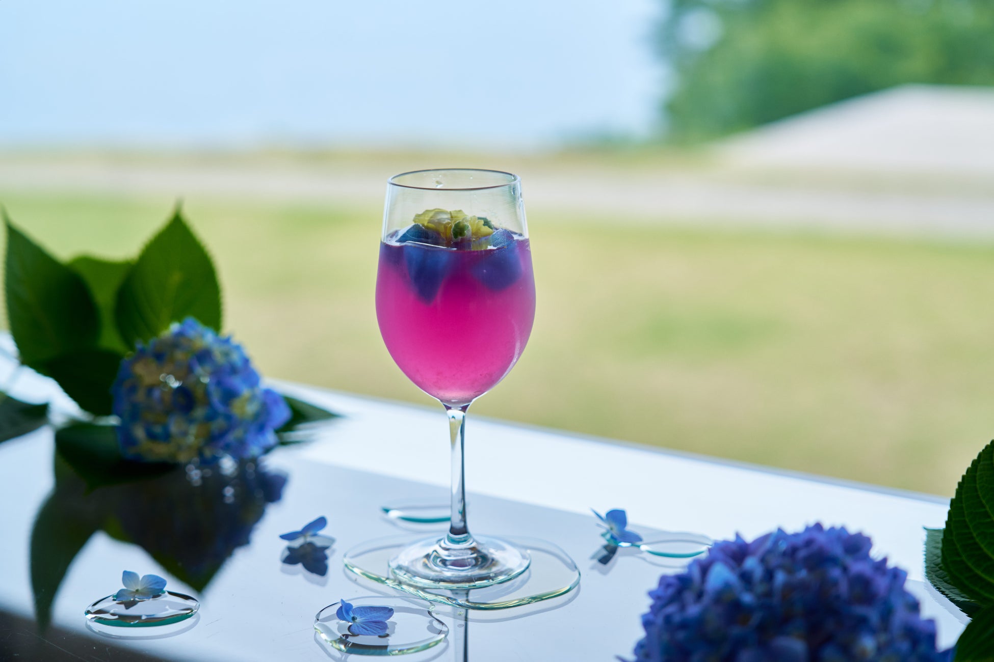 詳細:グラスの上に、まるで雨空に浮かぶ雲のようなふわもこのわたあめをトッピング。このわたあめに上からエルダーフラワーのシロップを注ぐことで、グラス内のバタフライピーのハーブティーが青から赤へとゆっくり色が変化します。紫陽花を思わせる美しい色のグラデーションをお楽しみください。