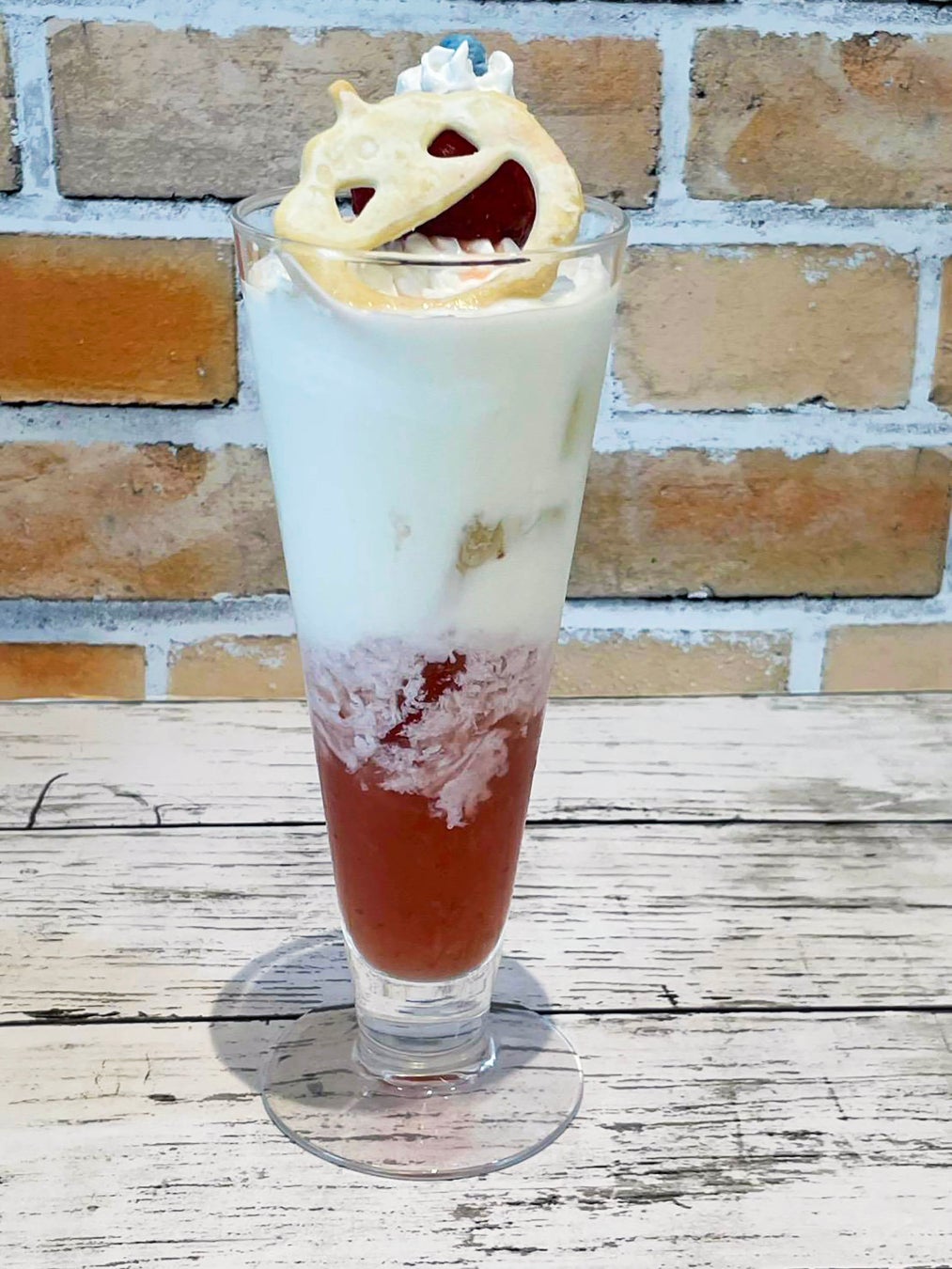 鳥取県産オリジナルいちご「とっておき」を、鳥取県民のソウルドリンク「白バラ牛乳」と一緒に味わえる一品。ピンクと白の2層の色合いがきれいないちごオレになっております。ジャックオランタンのトッピングもあり、ハロウィンらしいドリンクとなっております。